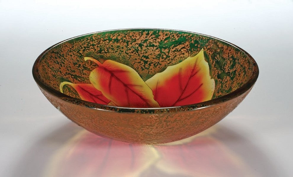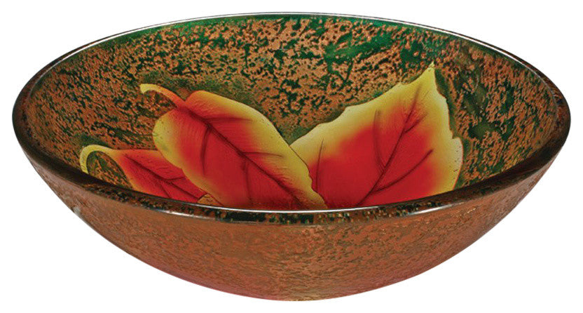 This Vessel Bathroom Sink with its lovely pattern is the perfect solution to your washing requirements. Made from tempered glass , this sink further complements your bathroom with its matching chrome pop-up drain in the center and mounting ring. It is available in a range of finishes for you to choose from. The sink is circular in shape and resistant to fire, scratch, shock, rust and UV light. The Vessel Bathroom Sink is eco-friendly, antimicrobial, non-toxic, and drip free. It can even be used outdoors. The sink is simple to maintain as you only need to wipe it with glass cleaner and a dry cloth. Finish: Autumn Leaf