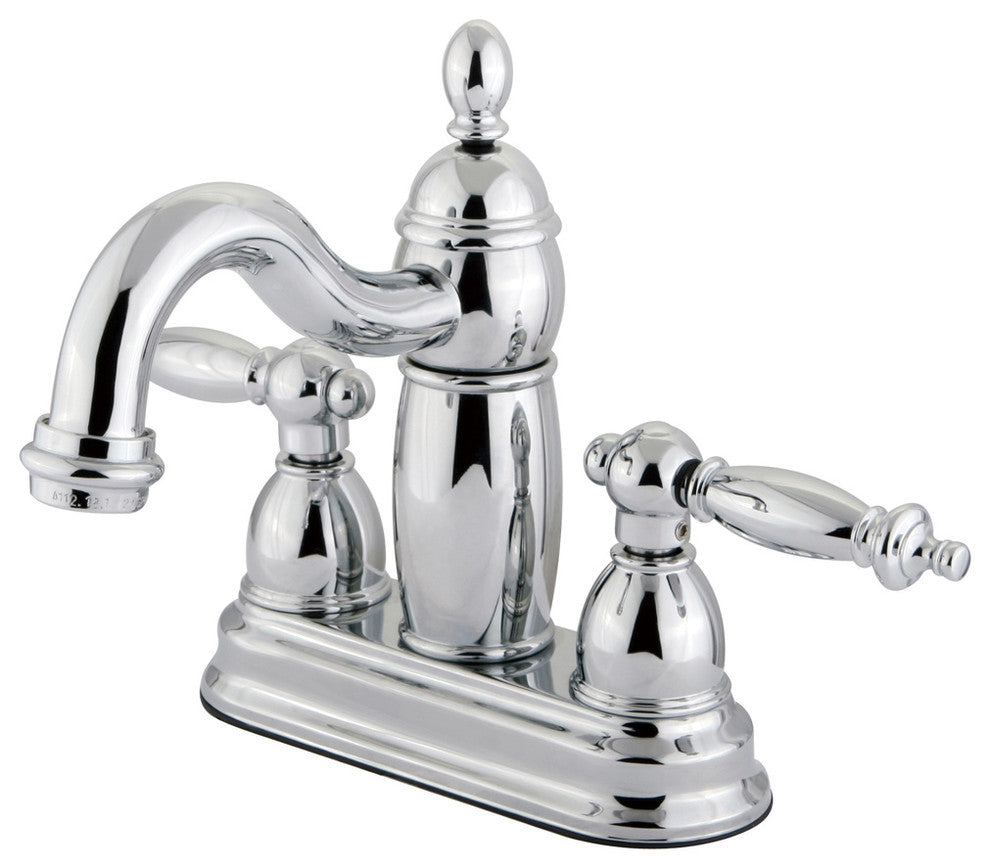 This faucet embodies all the traditional qualities of classic refined elegance. Its unique steeple-shaped design and hook-shaped spout will give your bathroom that one-of-a-kind look. This faucet has a deck mount setup and features a 4" centerset installation. The body is fabricated from solid brass for durability and long-lasting use. The color finish is made of polished chrome for that reflective shine, as well as resisting scratches, corrosion and tarnishing. The spout has a reach of 5" and a height of 6". The handles allow for easy management of water volume and temperature. The faucet operates with a ceramic disc valve for droplet-free functionality with the water measured 1.2 GPM / 4.5 LPM and a 60 PSI maximum rate. An integrated removable aerator is inserted beneath the spout''s head piece for conserving water flow. A brass pop-up drain in a matching finish is included. All mounting hardware is included and standard US plumbing connections are used. A 10-year limited warranty is provided to the original consumer. Matching brass pop-up drain included 5" spout reach 6" spout height 3-1/2" spout clearance