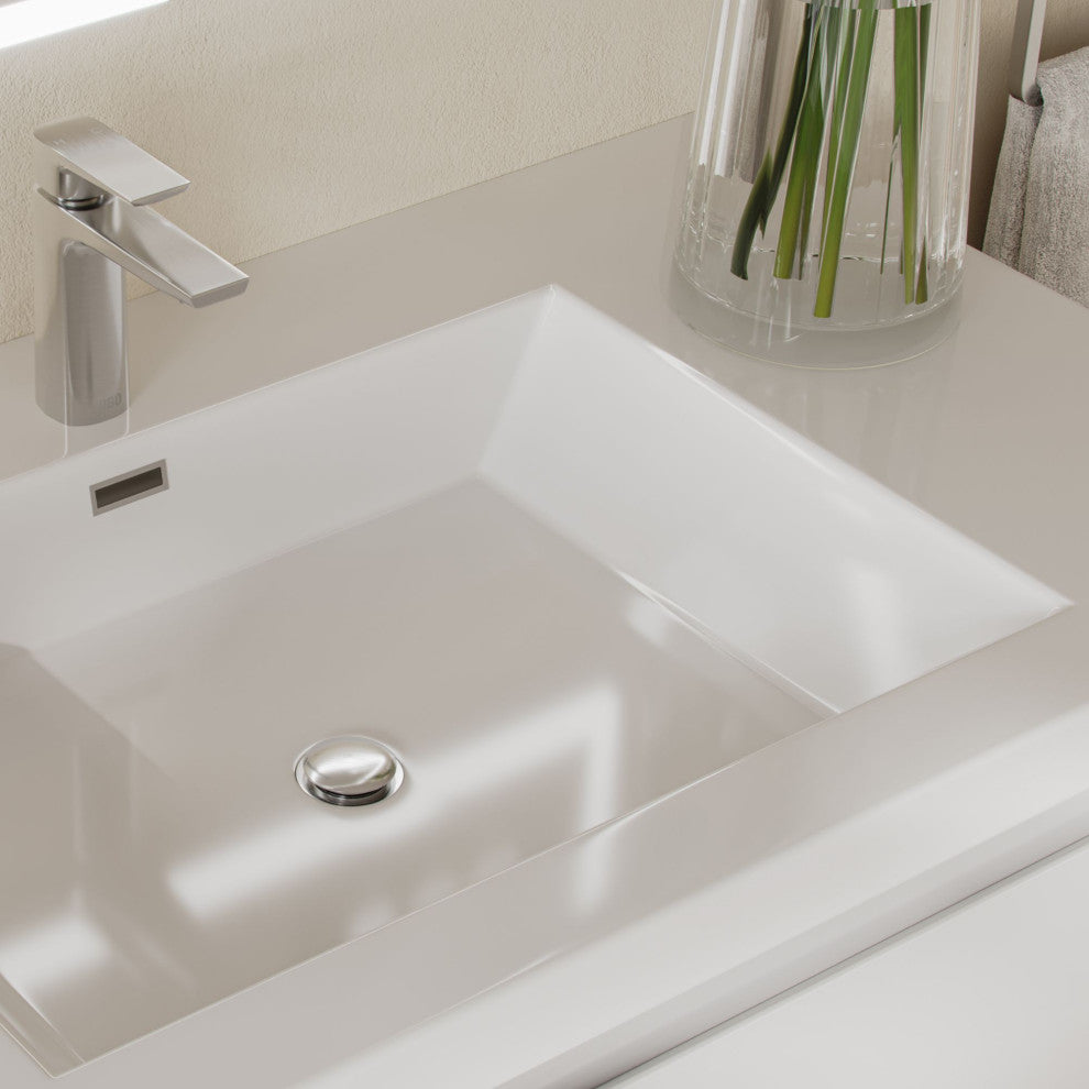 The Beacon bathroom vanity accentuates and elevates any modern bathroom with its seamless design. A rectangular basin sink is integrated within the reinforced acrylic counter for a flawless aesthetic. Built into the moisture and water-proof base are two soft-close drawers that offer ample room for toiletries and towels. This vanity comes assembled for easy installation. Available in gloss or wood finishes. Product Info:35.5" W x 19.75" D x 22.5" HReinforced acrylic composite top with a single sinkVanity top pre-drilled for 1.4 in. for a single hole faucet--faucet sold separately Chrome overflow pre-drilled for 1.7 in. for smooth water flow--pop drain sold separatelyIncludes installation hardware and aluminum handles--mirror sold separately Veneer medium density fiberboard cabinet compliments the white acrylic top for a durable and seamless feelSingle vanity makes installation easier while optimizing storage space2 drawers offers ample storage spaceScratch, stain, and bacteria resistance surface is virtually maintenance freeIntegrated European soft-closing hardwareUnit comes fully assembled for fast and easy installationMulti stage finish to ensure durability and quality One Year Product Warranty