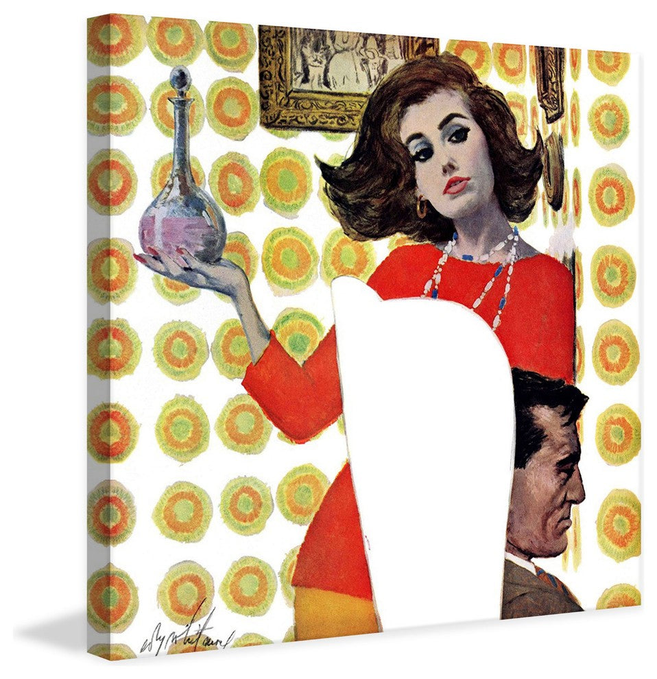 "The Love Potion" Painting Print on Canvas by Coby Whitmore features vivid tones and supple artistry. Printed on canvas, this 18 inch wide by 18 inch tall piece will be an exceptional addition to any room. Fine art canvas print from the Marmont Hill Art Collective Professionally hand stretched Gallery wrapped in sustainable, non-warping wood Arrives ready to hang Made in the USA Includes a certificate of authenticity Vintage Fashion artwork licensed from the archives of the Saturday Evening Post