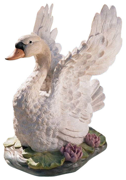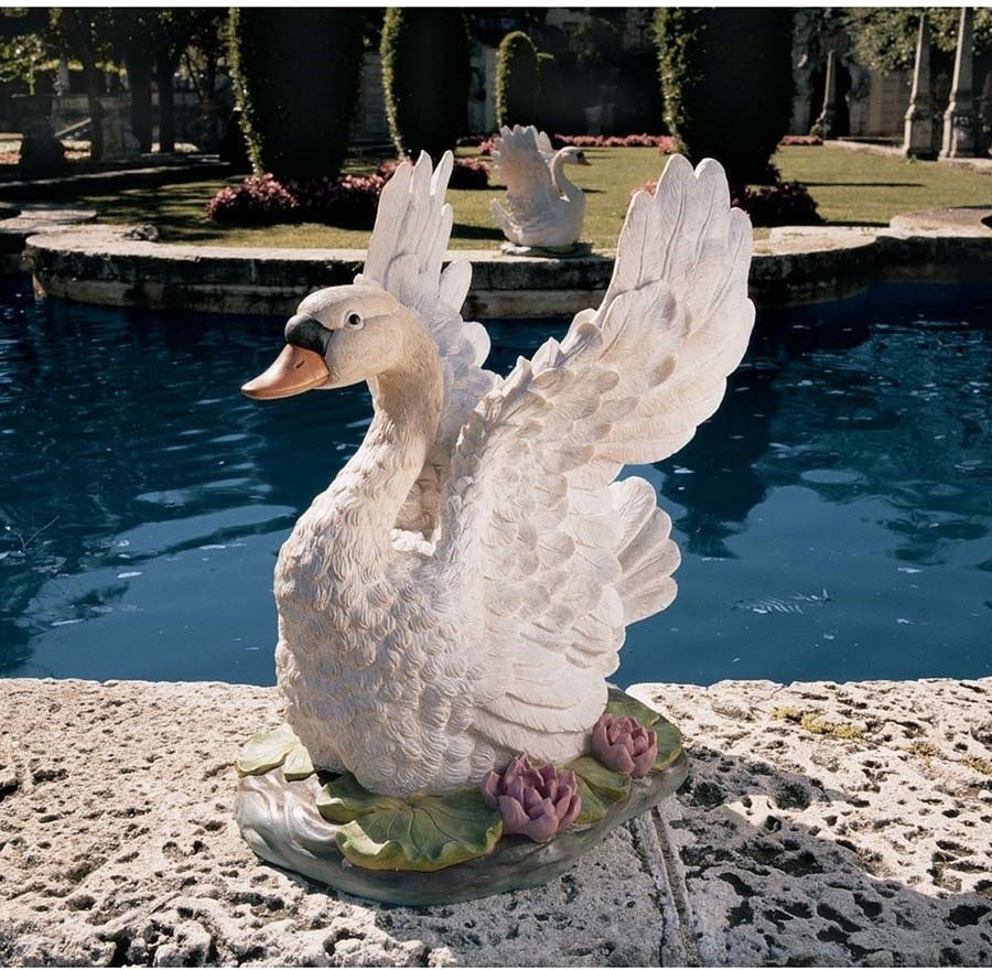What''s more profoundly beautiful than a grand swan? The grace and beauty of Swan Lake is captured with this life-size, hand-painted sculpture boasting exquisitely detailed wings. Create an idyllic setting in home or garden by welcoming this long-necked sculpture, cast in quality designer resin exclusively for Toscano. 14"Wx19"Dx23"H. 17 lbs.