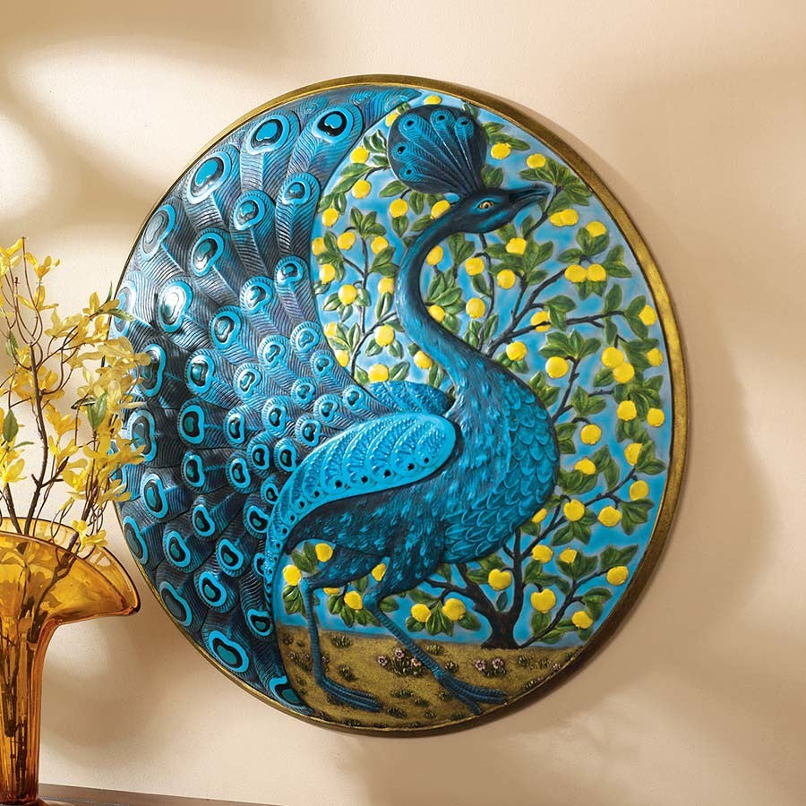 Echoing the inspired designs of the Arts and Crafts era, this almost two-foot-diameter sculpture boasts an intricate pattern and palette that celebrates nature''s showiest bird. The elegant peacock is cast in quality designer resin before being hand-painted in the Persian palette of dark blue, turquoise and lemon yellow that epitomizes De Morgan''s style. The artist was a lifelong friend of William Morris and a one-time artist for Morris & Co. This two-dimensional, quality decor piece is - as you''d expect - found only at Basil Street Gallery! 22"dia.x4"H. 6 lbs.