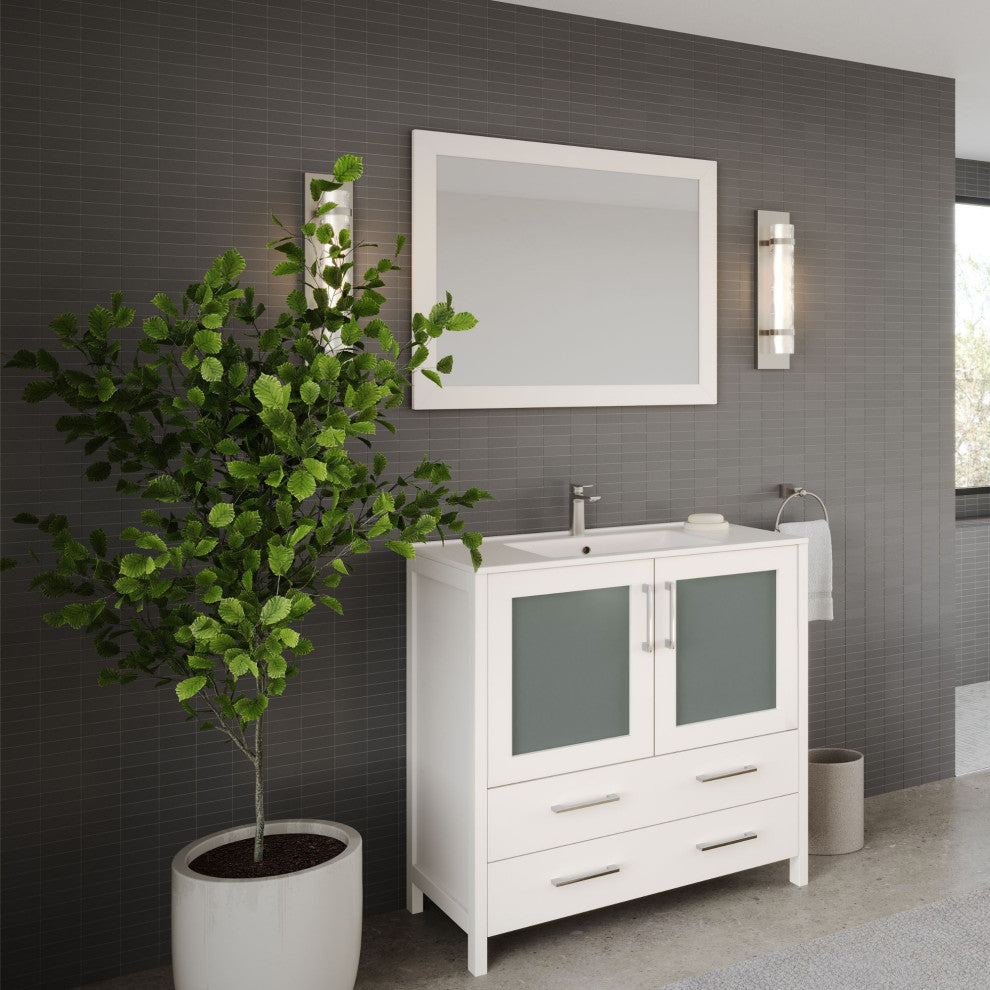 Let the clean-lined look of the Pullman vanity guide your bathroom toward a cool, contemporary design. Single-sink vanity setIncludes standard mirror, countertop, sink basin and cabinet hardwareDoes not include faucetCeramic countertopSoft-closing hardware1-year parts warranty against product defectsColor: WhiteMaterials: Solid + Manufactured Wood, MirrorMirror dimensions: W 35" x H 27.5"Vanity dimensions: W 36" x D 18" x H 35.8"