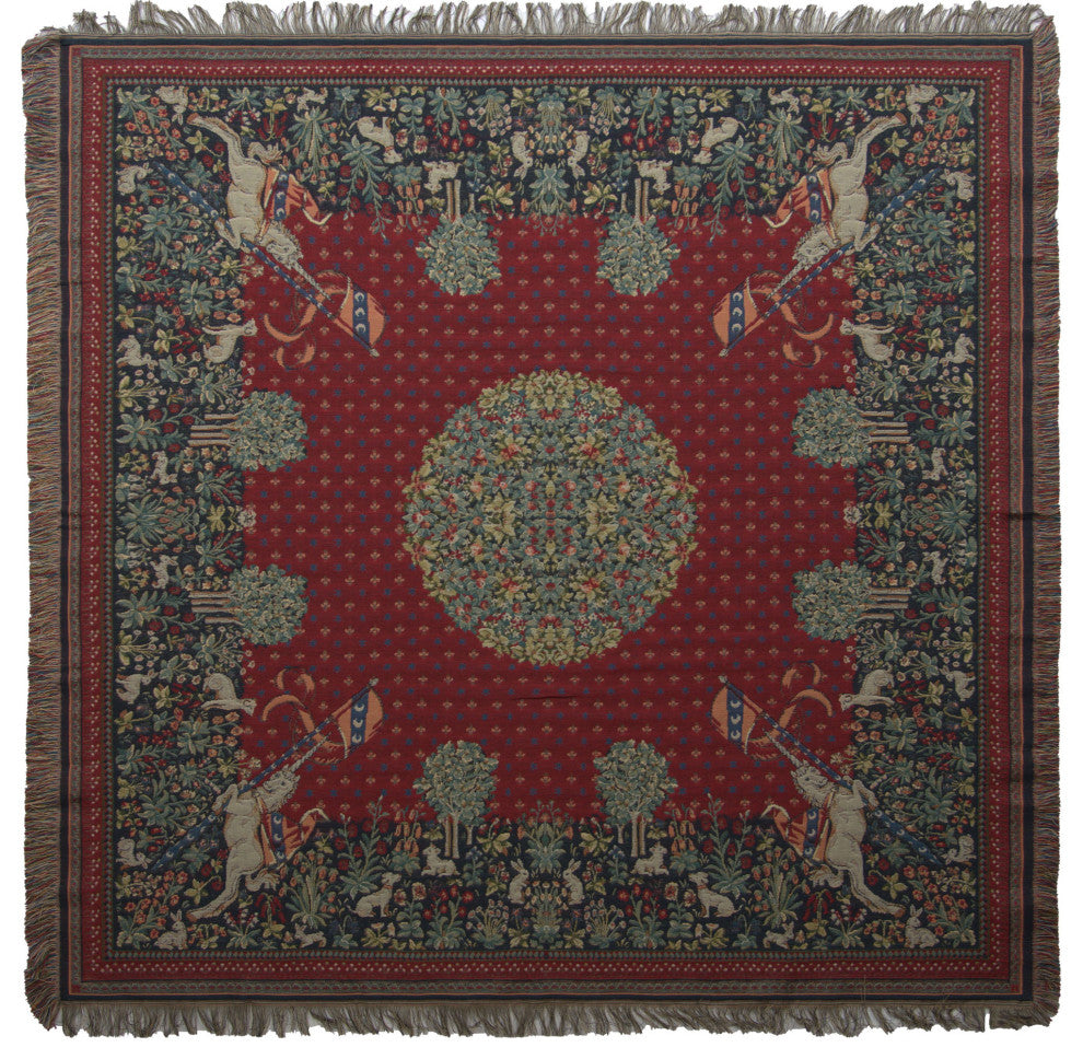 The Unicorn I woven European throw features the look of the "Lady and the Unicorn" series.This throw features a vibrant red background with a border of the foliage and unicorn''s of the Lady and the Unicorn series. There is a unicorn in each corner and a round bunch of flowers and foliage in the center.