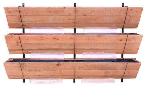 The design of Flower Street Urban Gardens refines the simplicity, durability, functionality, and the aesthetic of what a superior vertical garden should be. Its modular design offers a range of versatile options including the ability to be hung in groups to create a lush living wall. This is a full scale vertical garden that doesn"™t mess around. It brings you all of the practical design features that allow you to produce stunning aesthetic impact. If you"™re looking for a system that has the capacity to grow full sized vegetables in a small space then look no further. In practical application, alternative products can easily stain or erode surfaces. Other systems have limited space for root systems which limits what vegetables (if any) you can grow. Each unit is designed to drain excess water down through its tiers. The bottom drip edge can be angled to direct the water run off away from walls so no calcification or staining occurs. The materials include red cedar which is naturally rot resistant and has an impressively low carbon footprint. Each tier is lined with a BPA free, agricultural grade food liner. The liners are perforated to facilitate the drainage as well as keeping the soil separated from the wood facade. Each bolt-on unit uses three steel mounting brackets to allow the unit to attach directly onto any sound vertical structure. These frames have a designated hole on the top and bottom of the mounting bracket to adhere the unit using the bolts we provide, ensuring ease of assembly and strong structural support.Easy DIY assembly Features a warm aesthetic and is handicap accessible. Meets the needs of novice gardener and the master gardener alikeDesign is decorative and functional making the most out of your space by growing verticallyGreat for growing vegetables, herbs, flowers and succulents on your wall or fence