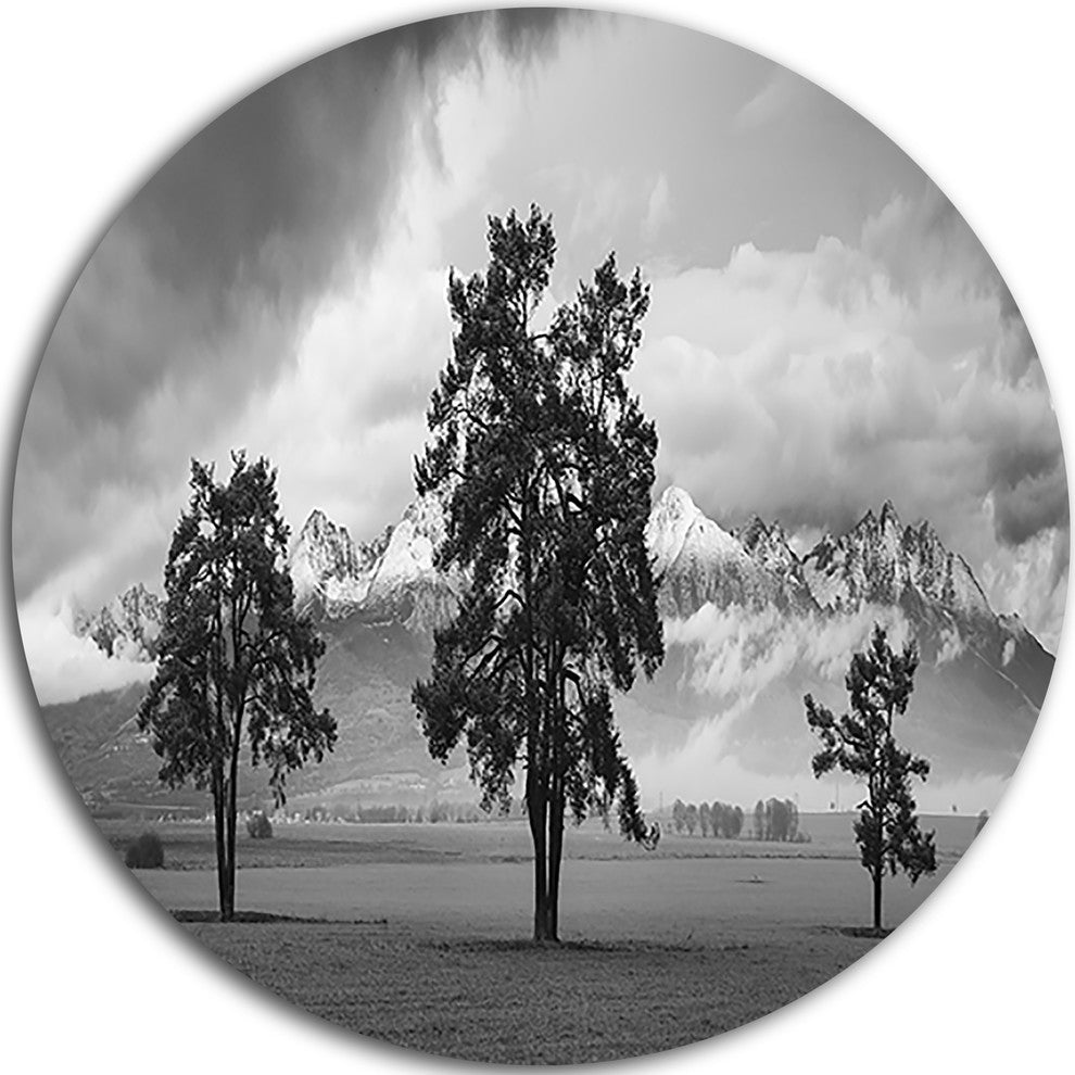 Three Trees In Front Of Mountains, Landscape Round Metal Wall Art, 23"