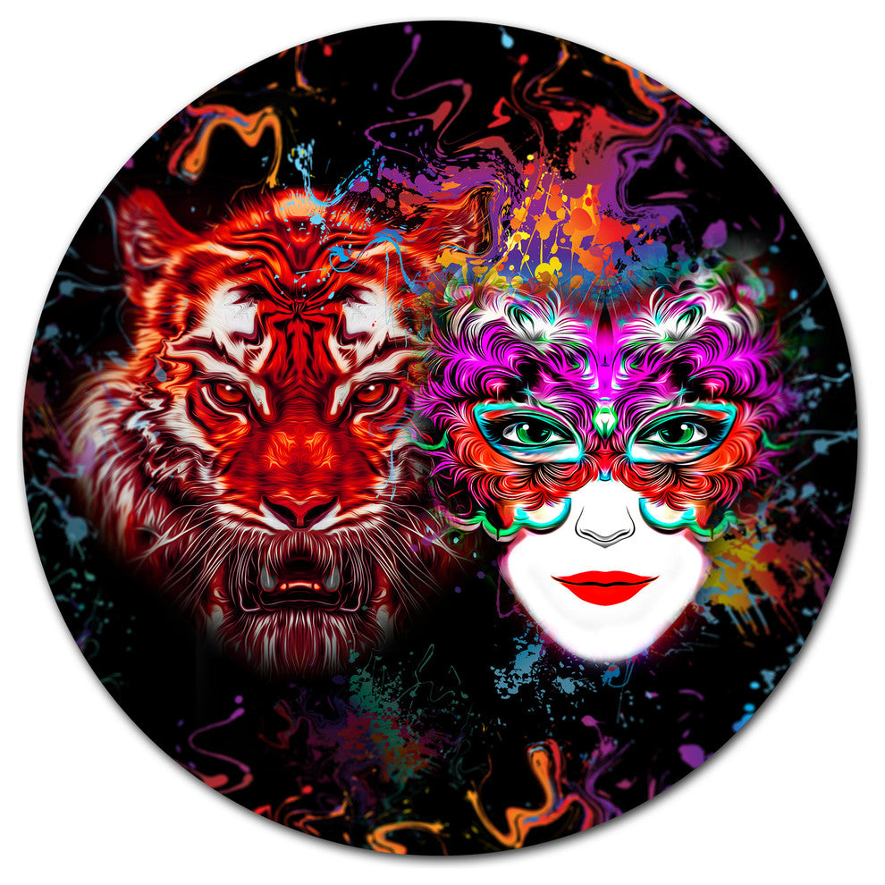 Tiger And Woman Colorful Faces, Abstract Large Disc Metal Wall Art, 36"