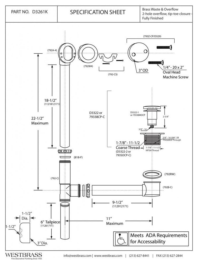 This ADA approved bath drain plug from Westbrass, features a tip-toe design, to easily open and close your tub drain. This style is ideal for waste and overflow drainage and is operable from inside the tub. Press drain to close, press again to open. The all exposed design is perfect for pedestal tubs and completely exposed applications. Available in a variety of finishes, this item is sure to complement your existing decorative fixtures.