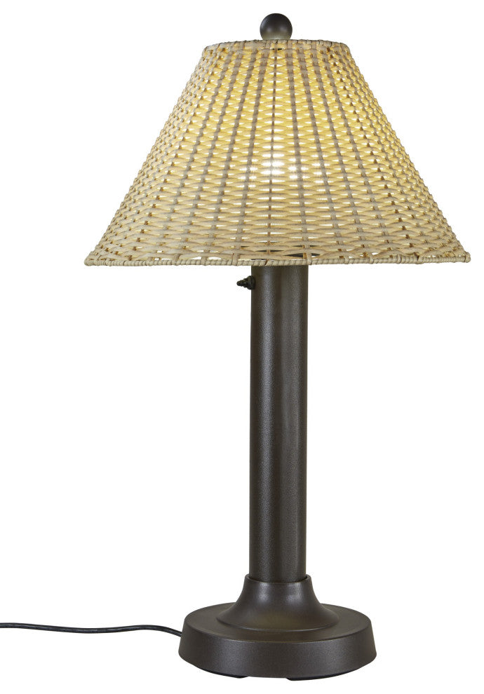 Patio Living Concepts TL-19257 Tahiti II 34" Table Lamp 19257 with 3" bronze tube body and tight weave, flat wicker, stone shade. All-weather full woven pattern, using flat PVC wicker highlights this shade, which completes the acrylic light globe in this elegant outdoor lamp. Features weatherproof all resin construction with heavy weighted base, two level dimming switch and 13 ft. weatherproof cord and plug. Waterproof light bulb enclosure allows the use of a standard 100 watt light bulb or comparable LED or CFL bulb. Dimension: 20Lx20Wx34H in.