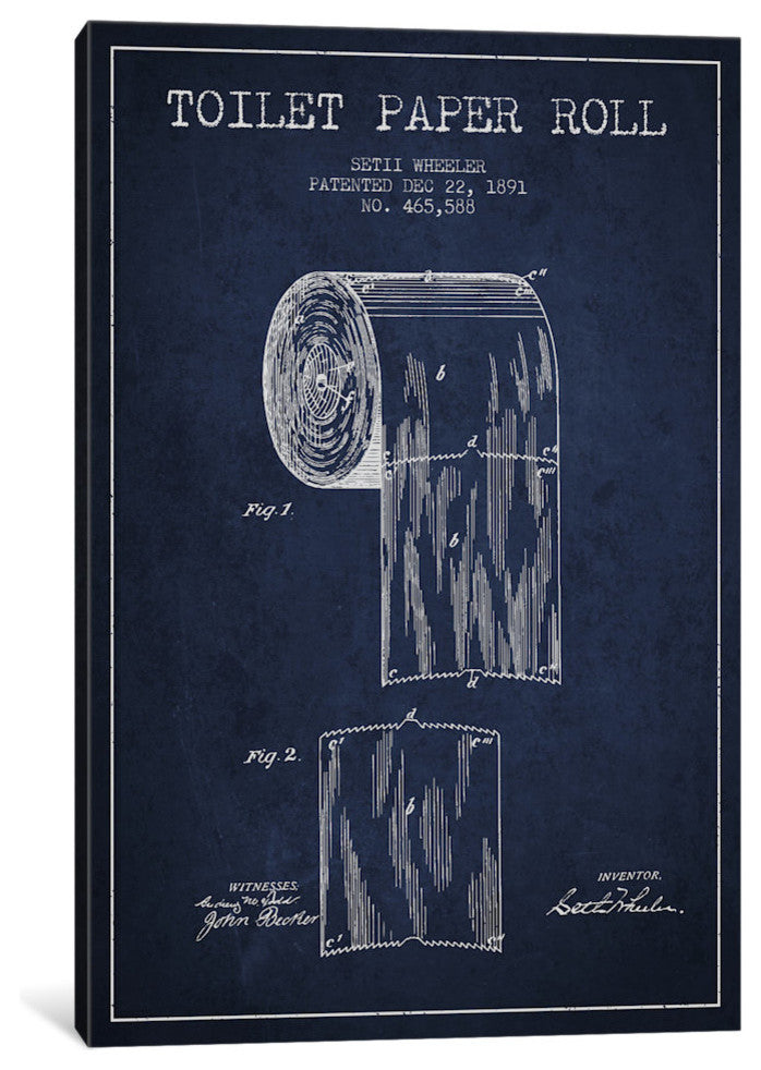 "Toilet Paper Navy Blue Patent Blueprint" by Aged Pixel, 40x26x1.5"