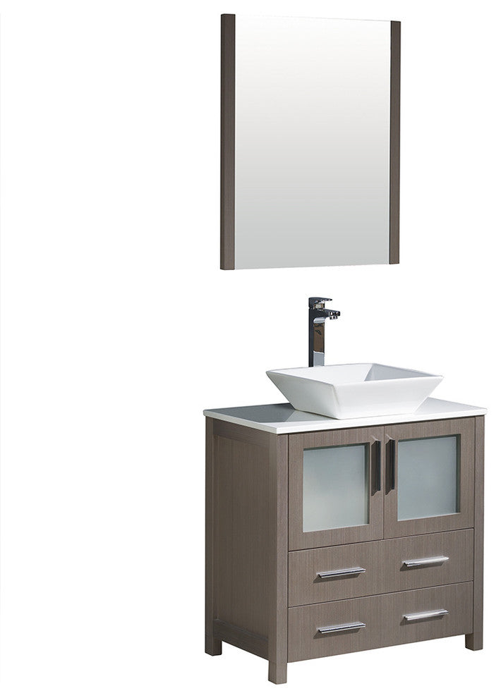 Details of the Fresca Torino 30" Gray Oak Modern Bathroom Vanity with Vessel Sink - FVN6230GO-VSLFresca is pleased to usher in a new age of customization with the introduction of its Torino line. The frosted glass panels of the doors balance out the sleek and modern lines of Torino, making it fit perfectly in either ''Town'' or ''Country'' decor. Available in the rich finishes of Espresso, Glossy White, Light Oak and Gray Oak, all of the vanities in the Torino line come with either a ceramic vessel bowl or the option of a sleek modern ceramic integrated sink.Features: Dimensions of Vanity: 30"W x 18.13"D x 35.63"HDimensions of Mirror: 25.5"W x 31.5"H x 1.25"DMaterials: Engineered Wood, Ceramic Sink, Glass/Stone Composite CountertopSoft Closing Doors/DrawersSingle Hole Vessel Faucet Mount (Faucet Shown In Picture May No Longer Be Available So Please Check Compatible Faucet List)Included: Base Cabinet, Countertop, Sink, Faucet, Mirror, P-trap, Pop-Up Drain and Installation HardwareSink Color: WhiteSink Dimension: 15"x15"x4"Overflow: NoFinish Color: Gray OakFFT3072CH Features: - Dimensions: 2.2"W x 5.7"D x 12.2"H - Spout Height: 9.8" - Spout Reach: 4.7" - Finish: Chrome - Ceramic Mixing Valve - 1/2" - 14 NPS Connection - All Mounting Hardware Included