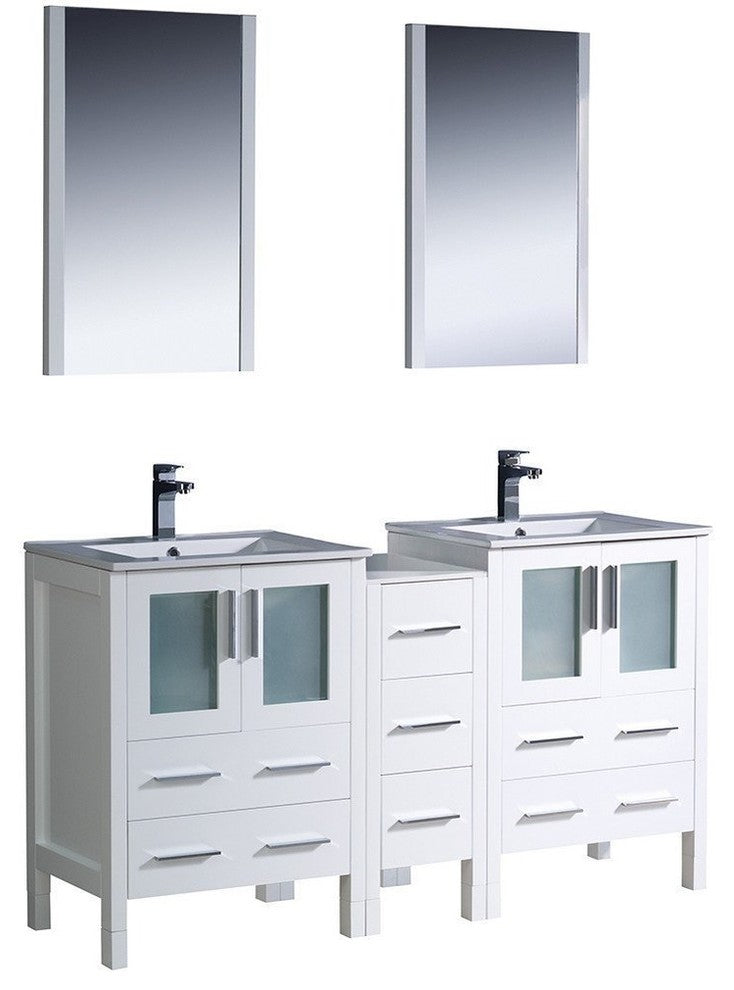 Details of the Fresca Torino 60" White Modern Double Sink Bathroom Vanity with Side Cabinet & Integrated Sinks - FVN62-241224WH-UNSFresca is pleased to usher in a new age of customization with the introduction of its Torino line. The frosted glass panels of the doors balance out the sleek and modern lines of Torino, making it fit perfectly in either ''Town'' or ''Country'' decor. Available in the rich finishes of Espresso, Glossy White, Light Oak and Gray Oak, all of the vanities in the Torino line come with either a ceramic vessel bowl or the option of a sleek modern ceramic integrated sink.Features: Dimensions of Vanity: 60"W x 18.13"D x 33.75"HDimensions of Mirror (x2): 20.75"W x 31.5"H x 1.25"DMaterials: Engineered Wood, Ceramic Sinks with Overflow, Glass/Stone Composite Countertop (12" Cabinet)Soft Closing Doors/DrawersSingle Hole Faucet Mounts (Faucets Shown In Picture May No Longer Be Available So Please Check Compatible Faucet List)Included: Base Cabinets, Side Cabinet, Countertops, Sinks, Faucets, Mirrors, P-traps, Pop-Up Drains and Installation HardwareSink Color: WhiteSink Dimension: 16.5"x11"x5"Overflow: YesFinish Color: WhiteFFT9151CH Features: - Dimensions: 2"W x 5.7"D x 6.3"H - Spout Height: 4" - Spout Reach: 4.7" - Finish: Chrome - Ceramic Mixing Valve - 1/2" - 14 NPS Connection - All Mounting Hardware Included