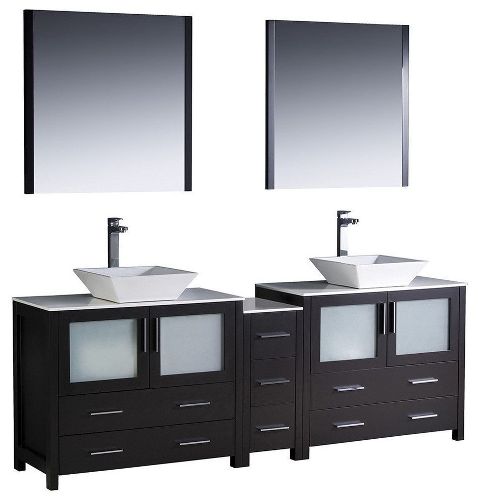 Details of the Fresca Torino 84" Espresso Modern Double Sink Bathroom Vanity with Side Cabinet & Vessel Sinks - FVN62-361236ES-VSLFresca is pleased to usher in a new age of customization with the introduction of its Torino line. The frosted glass panels of the doors balance out the sleek and modern lines of Torino, making it fit perfectly in either ''Town'' or ''Country'' decor. Available in the rich finishes of Espresso, Glossy White, Light Oak and Gray Oak, all of the vanities in the Torino line come with either a ceramic vessel bowl or the option of a sleek modern ceramic integrated sink.Features: Dimensions of Vanity: 83.5"W x 18.13"D x 35.63"HDimensions of Mirror (x2): 31.5"W x 31.5"H x 1.25"DMaterials: Engineered Wood, Ceramic Sinks, Glass/Stone Composite CountertopSoft Closing Doors/DrawersSingle Hole Vessel Faucet Mounts (Faucets Shown In Picture May No Longer Be Available So Please Check Compatible Faucet List)Included: Base Cabinets, Side Cabinet, Countertops, Sinks, Faucets, Mirrors, P-traps, Pop-Up Drains and Installation HardwareSink Color: WhiteSink Dimension: 15"x15"x4"Overflow: NoFinish Color: EspressoFFT3072BN Features: - Dimensions: 2.2"W x 5.7"D x 12.2"H - Spout Height: 9.8" - Spout Reach: 4.7" - Finish: Brushed Nickel - Ceramic Mixing Valve - 1/2" - 14 NPS Connection - All Mounting Hardware Included