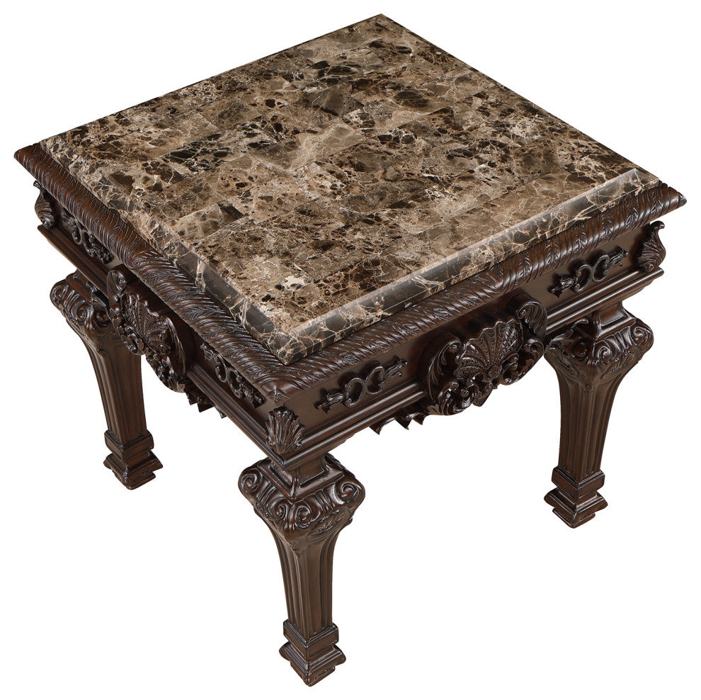 This charming living room table set is beautifully and carefully carved a wood design with marble top. It offers plenty of sophistication while simultaneously providing ample table top space. The detail legs are intricately carved to create stylish supports for the marble tops. Settling with nothing but classic features, highlighted in a beautiful cherry finish.Dimensions:Square Coffee Table: 46"L x 46"D x 21"HEnd Table: 28"L x 28"D x 27"HSofa Table: 54"L x 22"D x 35"HColor: CherryIncludes: (1) Coffee + (1) End + (1) Sofa TableMaterial: Solid Wood, Veneer, MarbleAssembly Required