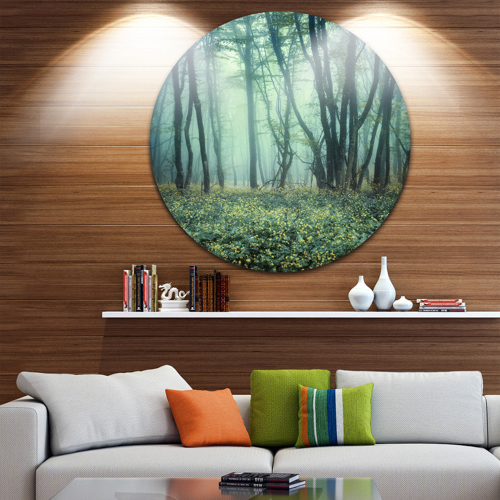 Bring Contemporary Abstraction to your home with this large Circle Metal wall art. This Trail Through Foggy Forest Metal Artwork makes it the focal point of any room or office.