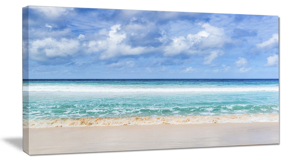 "Tranquil Beach Under White Clouds" Modern Seascape Canvas Artwork, 32"x16"