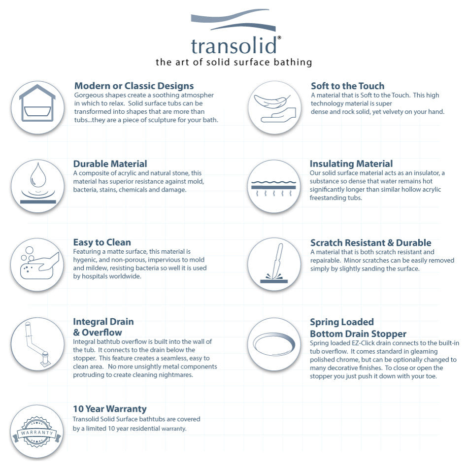 Transolid bathtubs are constructed of solid stone-like material which is thicker than Acrylic and helps to hold water temperature longer. The unique sculptural quality will bring beauty and attraction in your bathroom while the semi-gloss finish will add a rich velvet look. Transolid bathtubs ship in wooden crates with foam edges and side protection in order to prevent damage. The box also includes a fabric carrier, so the tub can be easily moved to your desired location.