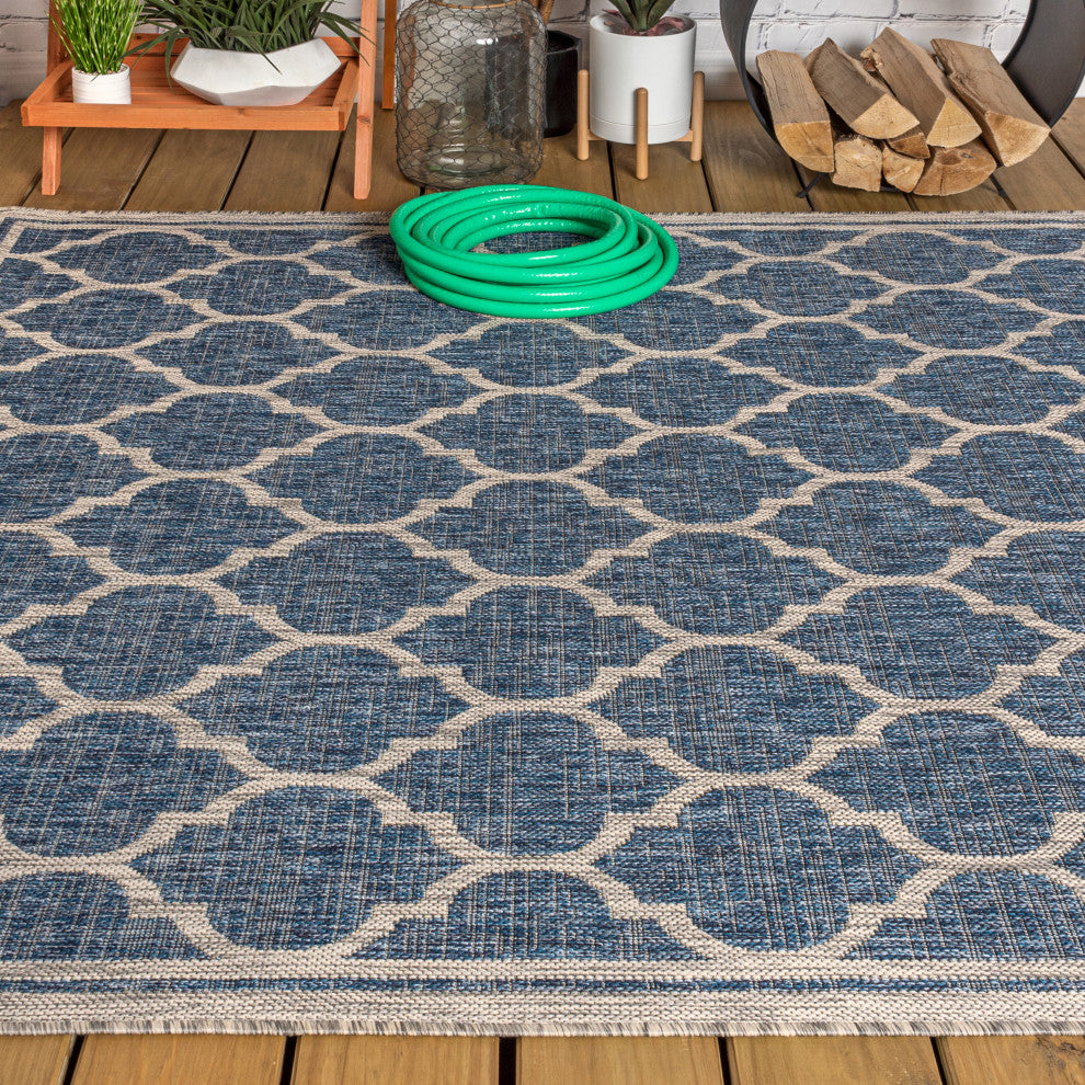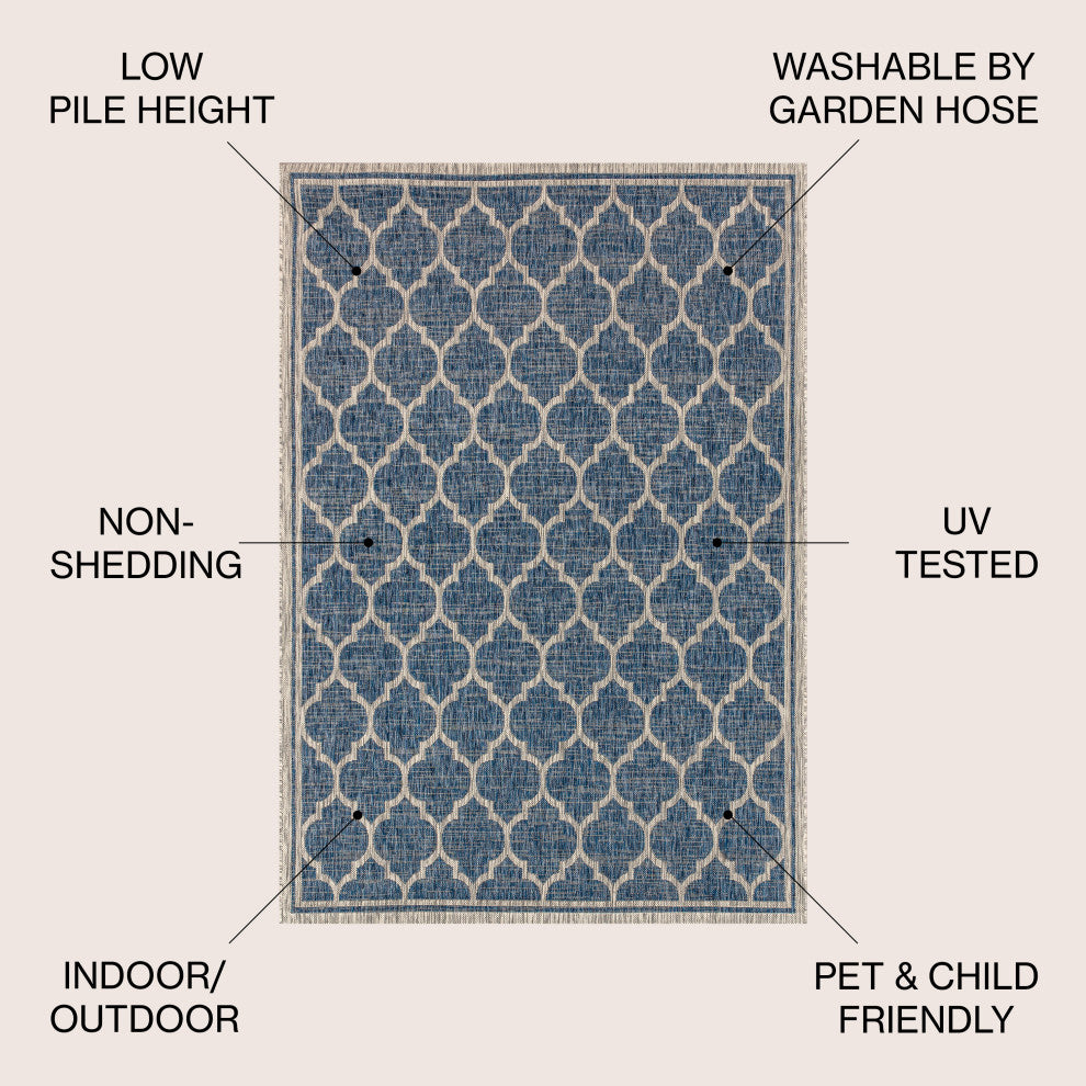 Our popular geometric design is inspired by Moroccan tile patterns. This classic rug adds eclectic style to an outdoor porch or patio. Mingled tones of blue and navy with a light gray ogee trellis pattern give this rug a hand-woven texture. The flatweave design is great for high-traffic spaces indoors too.Features:• Flat-weave construction of 100% polypropylene• Deep blues and light gray with a handwoven mingled texture• Water resistance with 0.19" pile• 100% Polypropylene• No backing, use of rug pad is recommended (sold separately)• Power Loomed in Turkiye• Actual Dimension: 10 ft. x 14 ft.• Color: Navy/Gray• Thickness measures: 0.19 in.• Available in multiple sizes and/or colorsRug Care:• Vacuum regularly and spot clean as needed; avoid direct and continuous exposure to sunlight; use brushless vacuum; remove spills immediately; if liquid, blot with clean, undyed cloth by pressing firmly around the spill to absorb as much as possible; for hard to remove stains, professional rug cleaning is recommended; store in a dry, well ventilated area and rotate for consistent wear• Packing and shipping may cause temporary creases in rugs, which will flatten out after a week on the floor; to expedite the process, try back-rolling your rug before laying it down, and then allow ample time for the remaining creases to relax• Please Note: Due to differences in monitors, some rug colors may vary slightly. Lengths and widths may vary from the published dimensions. Patterns may vary slightly according to shape and size selected.About us:Style your floors with JONATHAN Y. By combining fine craftsmanship and design, this New York creative studio is bringing fashion to your floors. The collection mixes sustainable organic materials, vibrant colors and trend worthy styles to create JONATHAN Y''s distinctive catalog of rugs.