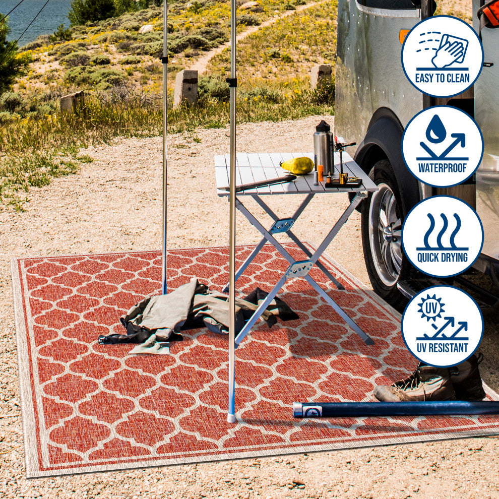 Our popular geometric design is inspired by Moroccan tile patterns. This classic rug adds eclectic style to an outdoor porch or patio. Mingled tones of red and rust with a beige ogee trellis pattern give this rug a hand-woven texture. The flatweave design is great for high-traffic spaces indoors too.Features:• Flat-weave construction of 100% polypropylene• Rusty-red and beige with a handwoven mingled texture• Water resistance with 0.19" pile• 100% Polypropylene• No backing, use of rug pad is recommended (sold separately)• Power Loomed in Turkiye• Actual Dimension: 6 ft. x 9 ft.• Color: Red/Beige• Thickness measures: 0.19 in.• Available in multiple sizes and/or colorsRug Care:• Vacuum regularly and spot clean as needed; avoid direct and continuous exposure to sunlight; use brushless vacuum; remove spills immediately; if liquid, blot with clean, undyed cloth by pressing firmly around the spill to absorb as much as possible; for hard to remove stains, professional rug cleaning is recommended; store in a dry, well ventilated area and rotate for consistent wear• Packing and shipping may cause temporary creases in rugs, which will flatten out after a week on the floor; to expedite the process, try back-rolling your rug before laying it down, and then allow ample time for the remaining creases to relax• Please Note: Due to differences in monitors, some rug colors may vary slightly. Lengths and widths may vary from the published dimensions. Patterns may vary slightly according to shape and size selected.About us:Style your floors with JONATHAN Y. By combining fine craftsmanship and design, this New York creative studio is bringing fashion to your floors. The collection mixes sustainable organic materials, vibrant colors and trend worthy styles to create JONATHAN Y''s distinctive catalog of rugs.