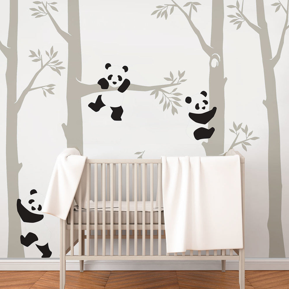 Your little one will be surrounded by Cute Pandas! Completely redecorate your nursery or kids room with our Tree with Panda decal set! Panda decals hug and hang from beautiful tree decals.Size: 96" (243 cm) Tree Size (approx): (Total width will vary based on how you choose to place the trees.)Tree Size (approx): (starting left) Tree 1: 35"w x 96"h (89 cm x 243 cm)Tree 2: 60"w x 96"h (152.5 cm x 243 cm)Tree 3: 41.5"w x 96"h (105.5 cm x 243 cm)Tree 4: 31"w x 96"h (79 cm x 243 cm)108" (274 cm) Tree Size (approx): (Total width will vary based on how you choose to place the trees.)Tree Size (approx): (starting left) Tree 1: 35"w x 108"h (89 cm x 274 cm)Tree 2: 60"w x 108"h (125.5 cm x 274 cm)Tree 3: 41.5"w x 108"h (105.5 cm x 274 cm)Tree 4: 31"w x 108"h (79 cm x 274 cm)What''s Included:4 TreesLeaves3 PandasAdditional Information: Pandas are always Black and White. If you want different colored Pandas, please contact us.