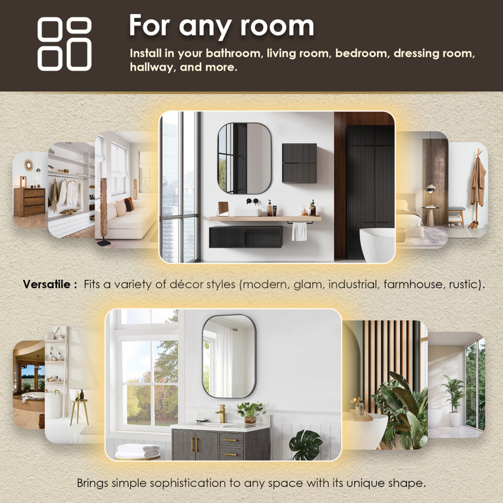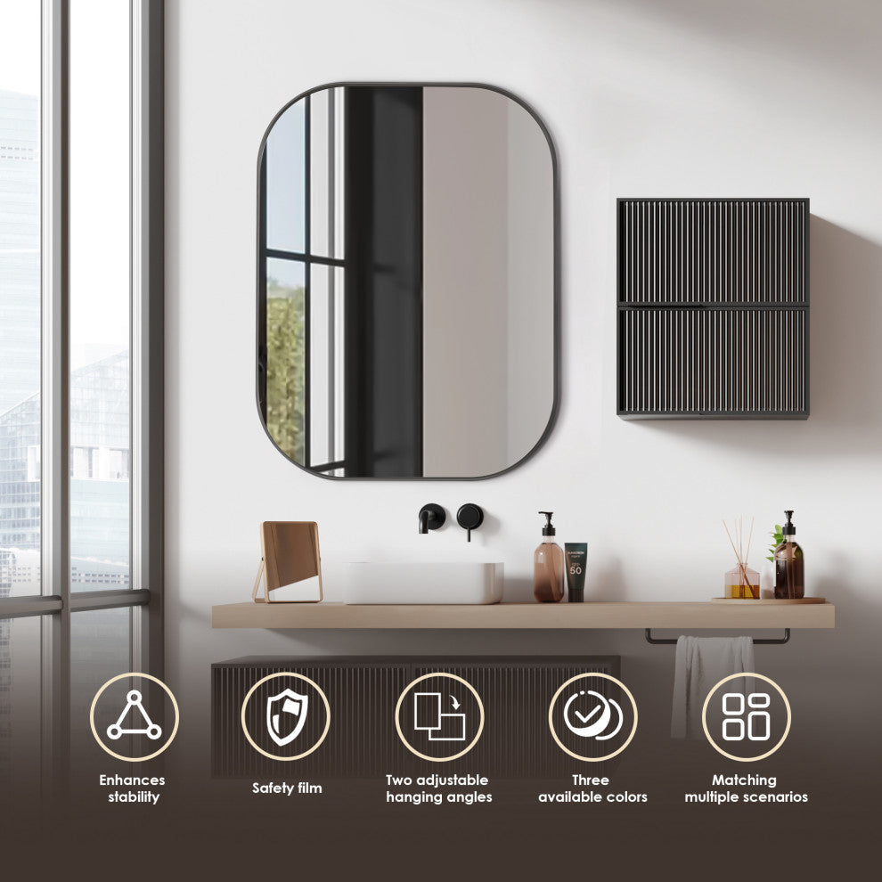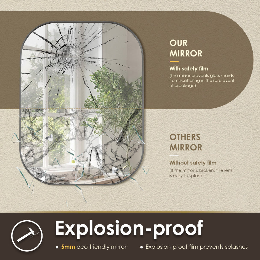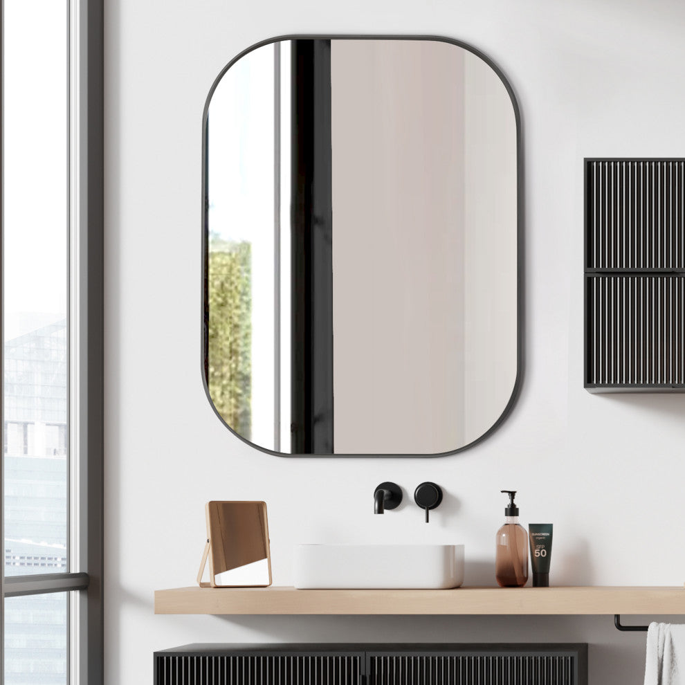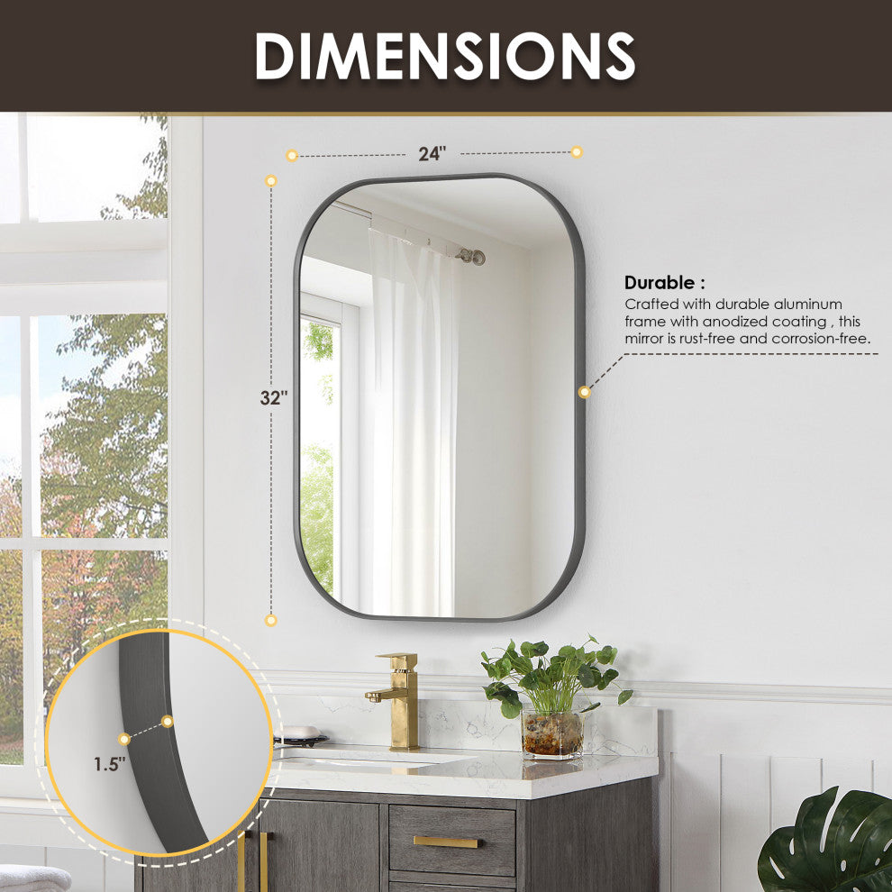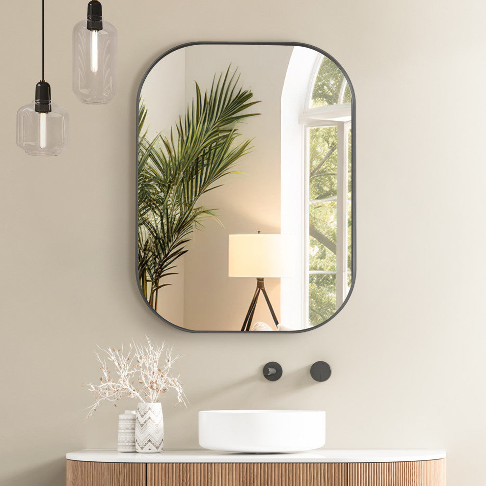 Whether hung in your guest washroom or master bath, our Trielle Wall Mirror adds a polished touch to any space. The sleek, rectangular design enhances the flow of natural light, making the room feel more expansive. The rounded edges give it a unique yet sophisticated, modern aesthetic. Framed with a slim aluminum band, the mirror boasts a clean and elegant silhouette. For added convenience, our Trielle mirror comes equipped with a Z-bar hanger, providing a versatile and effortless installation.FeaturesCrafted with a durable aluminum frame and an anodized coating, this mirror is both rust- and corrosion-resistantThe fully sealed metal frame enhances stability, ensuring a longer lifespan and superior durability.Mirror is available in Matte Black, Brushed Gold and Gunmetal finish to match and enhance your décor.The 5mm copper-free mirror features a safety film on the back that prevents glass shards from scattering in the unlikely event of breakage.The smooth curves enhance its refined look while providing a timeless appeal.Mounting brackets are included for both vertical and horizontal installation.Minimal assembly required. Installation instructions, hardware, and mounting bracket are included on the back.Designed to suit your preferences, this mirror complements a variety of décor styles, including modern, glam, industrial, farmhouse, and rustic.Perfect for any room, this mirror can be installed in your bathroom, living room, bedroom, dressing room, hallway, and moreFull Warranty: 1-Year Manufacturer Warranty"”purchase with peace of mind.