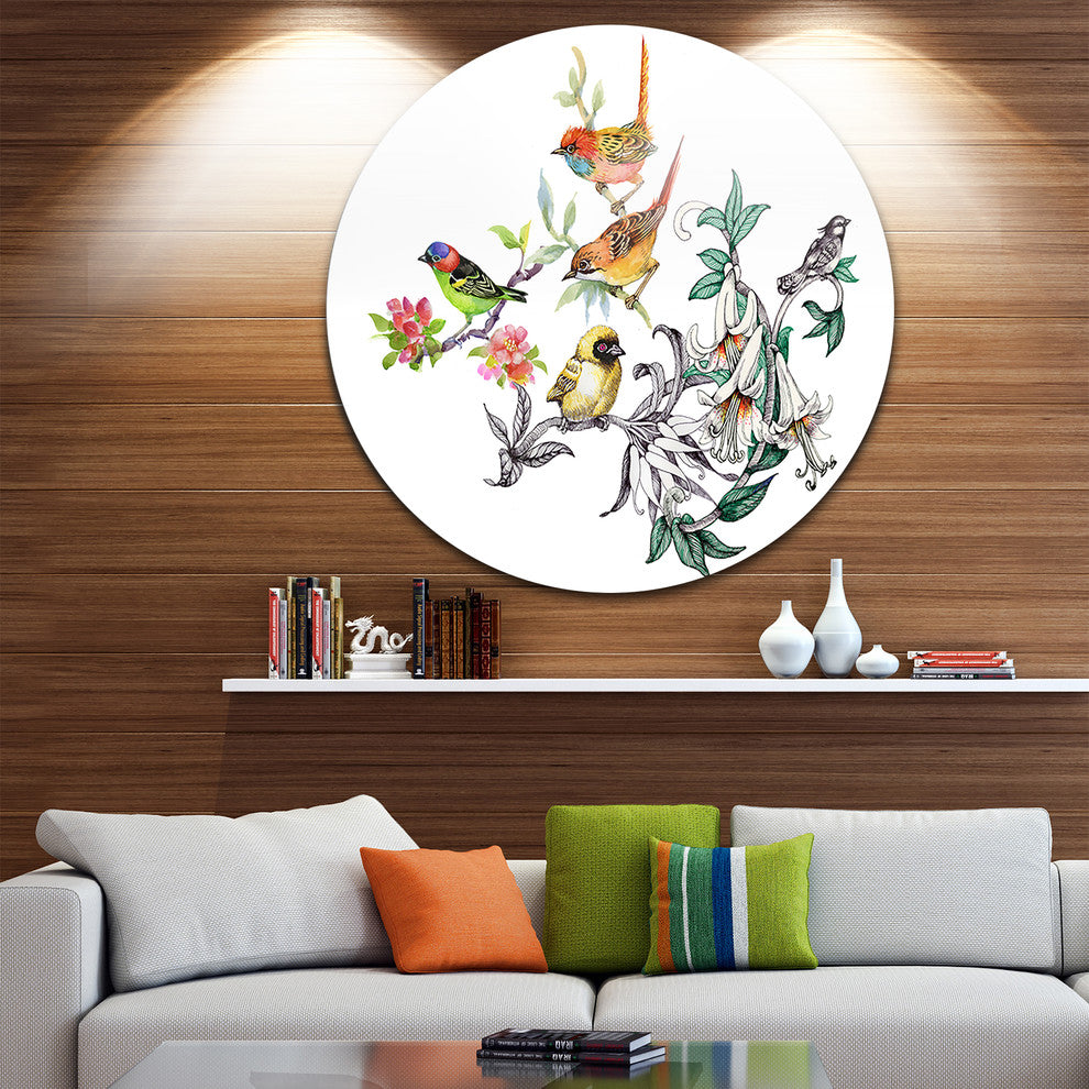 Bring Contemporary Abstraction to your home with this large Circle Metal wall art. This Designart-Tropical Flowers and Birds Metal Artwork makes it the focal point of any room or office.