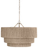 The familiar silhouette of a drum shade is magnified and multiplied in the Reza chandelier. Made from wrapped jute string, with an added layer of knotting that creates allover texture, the cascading shades feature a rich materiality and authentic handicraft that is carried through to the three string suspension cords. The antiqued Patina Brass finish of the metalwork blends neatly with the earthy palette.