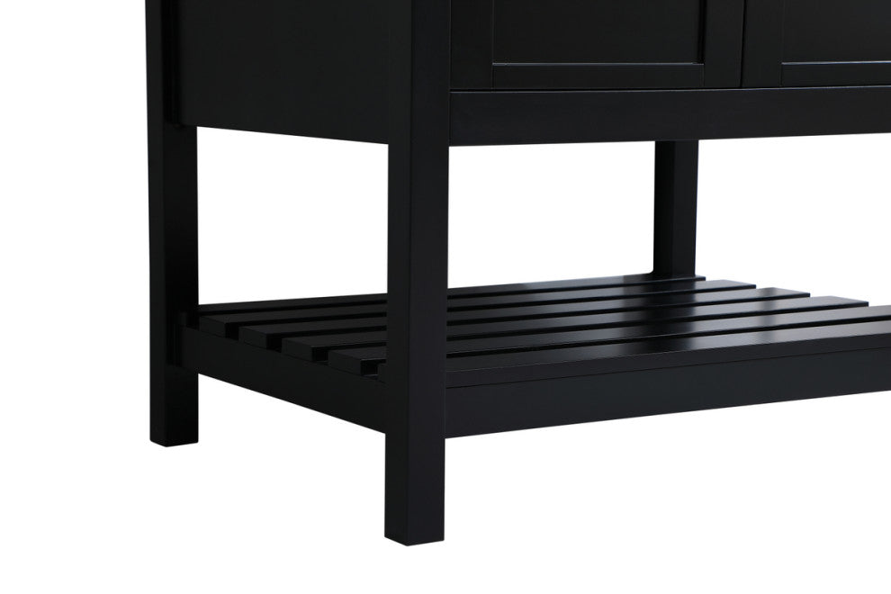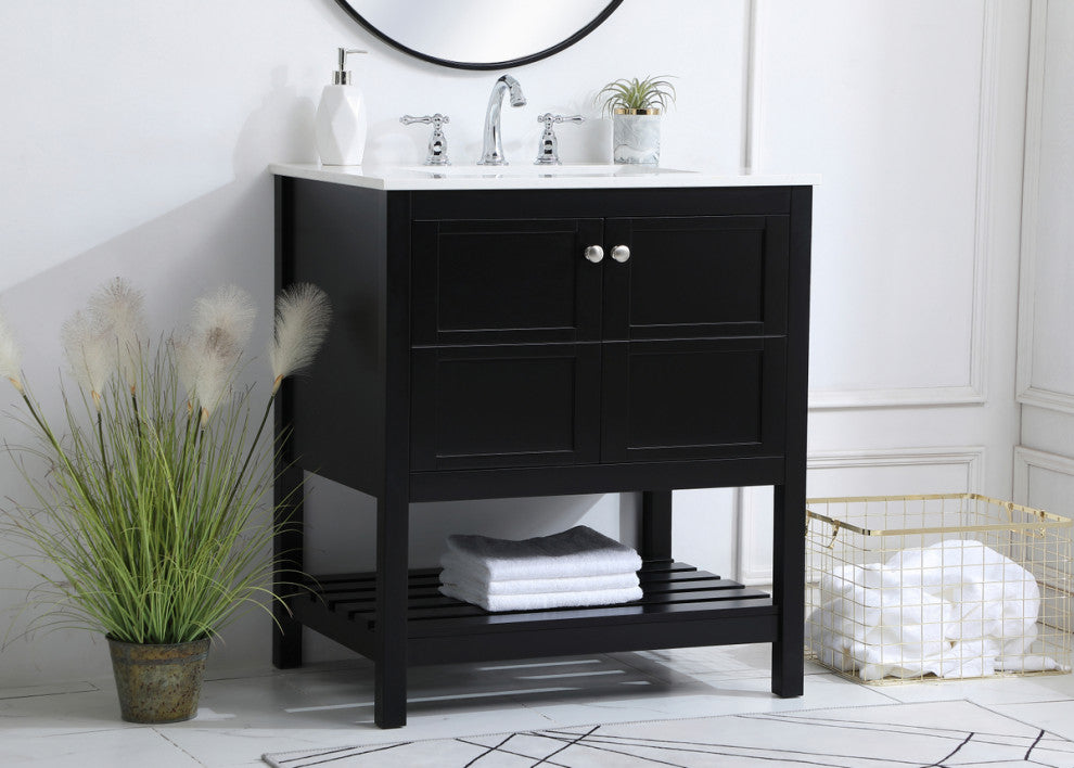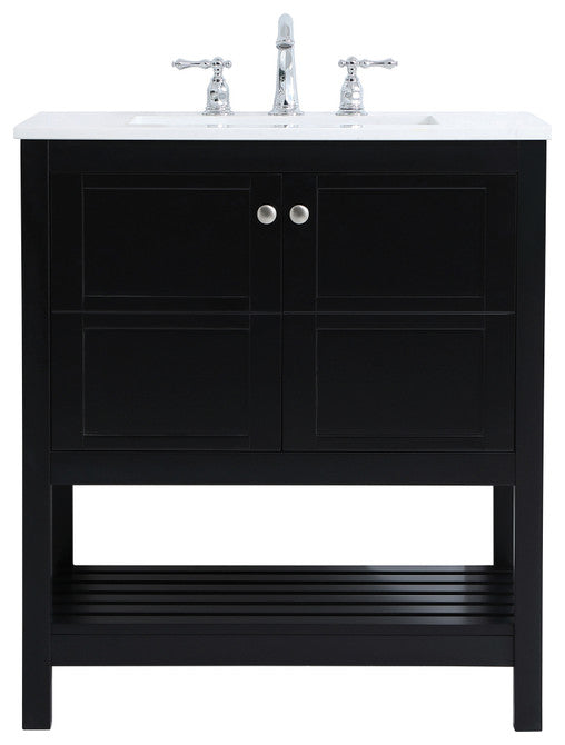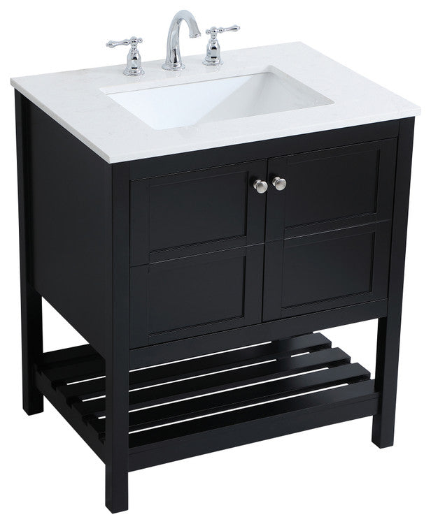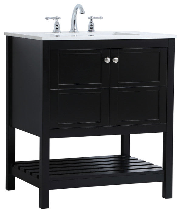 The subtle beauty of the Theo collection 30" vanity in a black finish exudes comfortable luxury. Its modern, yet traditional beauty will surely dress up your bathroom or powder room without any fuss. The white stone countertop and porcelain undermount sink shows quiet opulence, and the legs support upright without fail. Brushed Nickel hardware complements the trendy black finish, with pulls adorning the two cabinet doors, showcasing ample storage space within. Slated shelf allows for additional space to organize your towels. Whether this vanity is in your bathroom or for guests, its presence will surely elevate the aesthetics of your room. (FAUCET NOT INCLUDED)calacatta engineered marbleBrushed nickel hardwarecrafted with Solid wood and MDF (Rubberwood)Undermount porcelain sink is includedcomes with one bottom slated shelfconvenient access for plumbing installation with cut out back panelFree standing, no assembly required