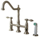 Nothing says traditional vintage like this bridge kitchen faucet from The Tudor Collection from Kingston Brass, its spray will help you tackle any kitchen chore, equipped with a ceramic cartridge and fabricated in Solid Brass for Long Lasting performance, Satin Nickel Lifetime Drip Free Ceramic Cartridge Max 1.8 GPM/6.8 LPM Water Flow Rate At 60 PSI (ASME standard) Deck Mount 4-Hole Installation With Side Sprayer Standard 1/2" IPS Connection