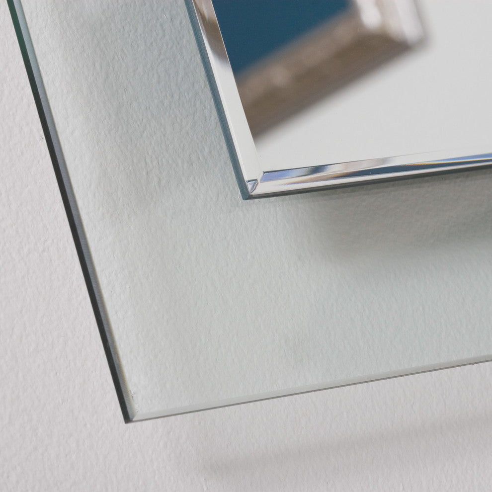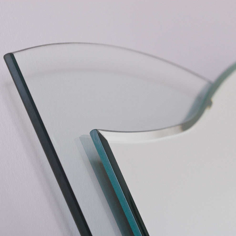 The Tula wall mirror is a fresh and beautiful decorative item for any room including living rooms, master suites or bathrooms. The fusion of a frameless mirror coupled with a bottom layer of clear glass creates a border featuring a 1/4" bevel that is a truly unique look.- Crafted from 2 layers of thick, strong 3/16 glass and metal- Double coated silver backing with seamed edges. - Mounting hardware included, comes ready to hang. Hangs vertically.- Great for Bathroom mirror, Vanity mirror, Living Room mirror or Bedroom mirror- 2" glass border with 1/4" bevel mirror. The front mirror left side measures roughly 27.5" high and the right side measures roughly 29.3" high. The back glass measures approximately