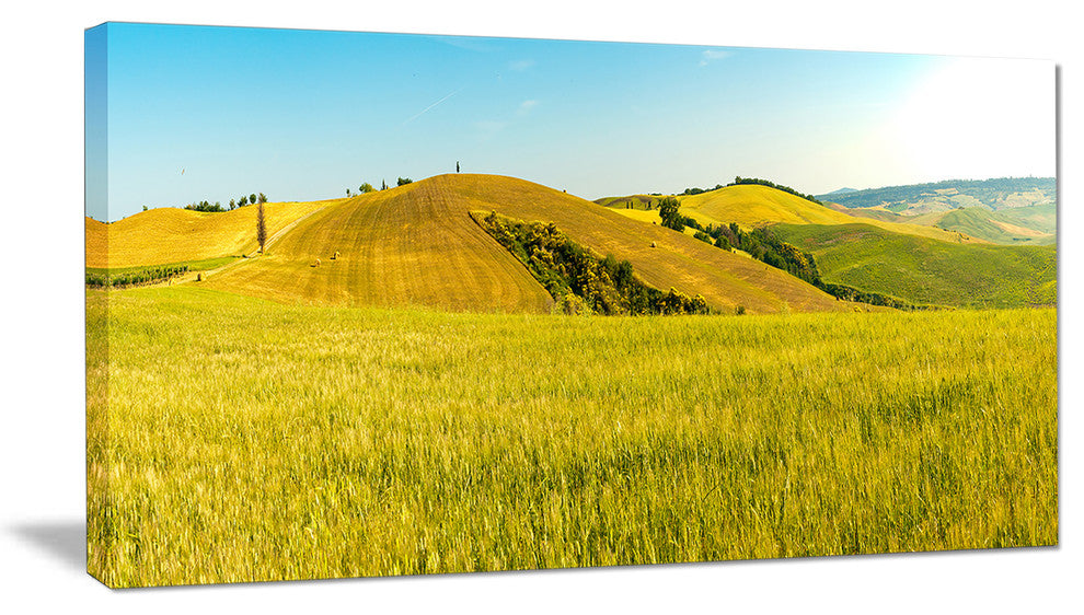 The Tuscany Wheat Field on Sunny Day canvas art print is sure to make an impression on anyone who sees it. This artwork is gallery wrapped around a 1-inch solid wood frame and arrives carefully packaged and entirely ready to hang on the wall. Design Art only uses the highest resolution and pigments to ensure a crisp colorful print that is never faded or pixelated. This artwork is sure to be a conversation starter in any home or office.