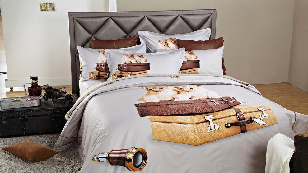Let your kids and guests start their morning with this cute and eye-catching animal print bedding featuring baby leopards arriving from their safari trip. The softness of the 100% combed cotton and the distinct gift packaging make these bedding sets a great choice for a gift. 4 Pieces Luxury Duvet Cover Set, Bed in a Box with Reversible Design. Fits Twin and Extra long twin size mattress up to 16 inches tall. Set includes: 1 Fitted bed sheet, 1 Duvet Cover, 1 Pillow case and 1 Pillow Sham. Hidden plastic snaps at the foot of the duvet cover make it easy to insert your quilt. Designed for exceptional softness and comfort with 100% Cotton at 300 TC. Modern dyeing technology for excellent brightness and long lasting colors. The complete bedding set comes in an elegant gift box and a Dolce Mela gift bag. Machine Washable: Normal w Cool Water - NO BLEACH - Tumble Dry. Package Content and Sizes in Inches: 1 Fitted Sheet 38 x 80 x 16 deep 1 Duvet Cover 68 x 90 1 Pillow Case 20 x 30 1 Pillow Sham 20 x 30 + 2 inch flange •  Duvet Cover Insert/Filler is not included in this set. NOTE: The digital images have the most accurate colors possible; computer monitors can display slight color variations of the actual product.