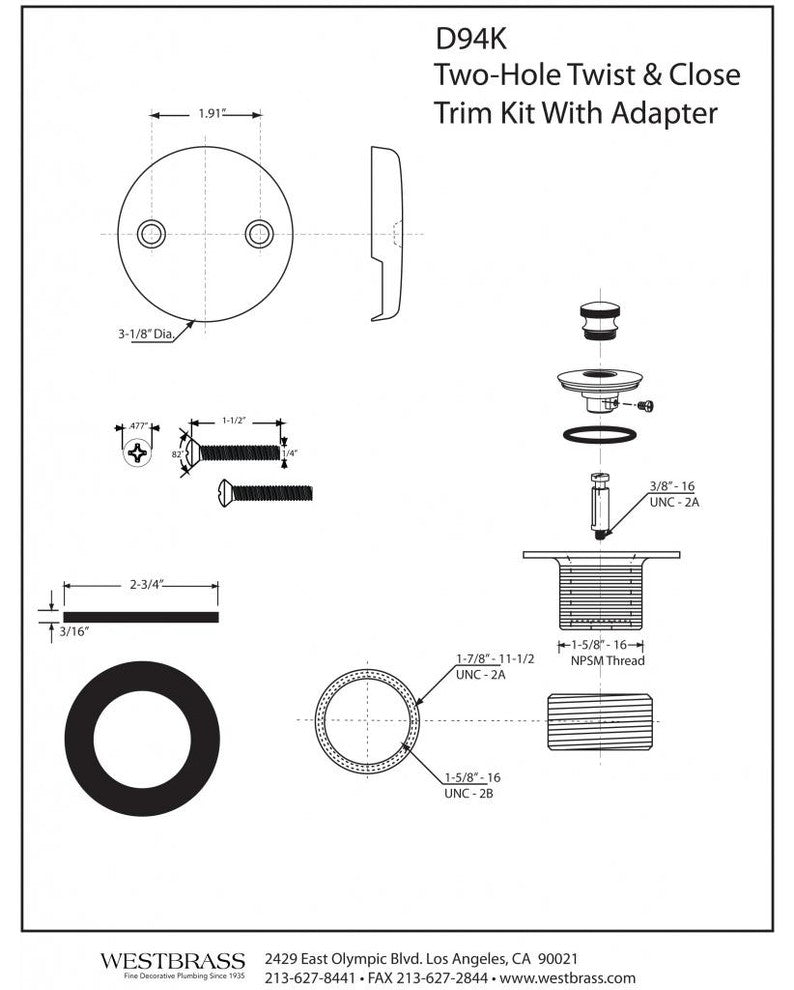 This designer twist & close waste and two hole overflow trim kit is the decorative solution and perfect finishing touch for your tub! Drain strainer sports fine thread 1-1/4 in. NPSM strainer with a 1-1/2 in. NPSM thread adapter. Push and turn stopper to close and pull again to open. You''ll be able to appreciate both the beauty and performance of this item for years to come thanks to superior quality finishing and solid construction.