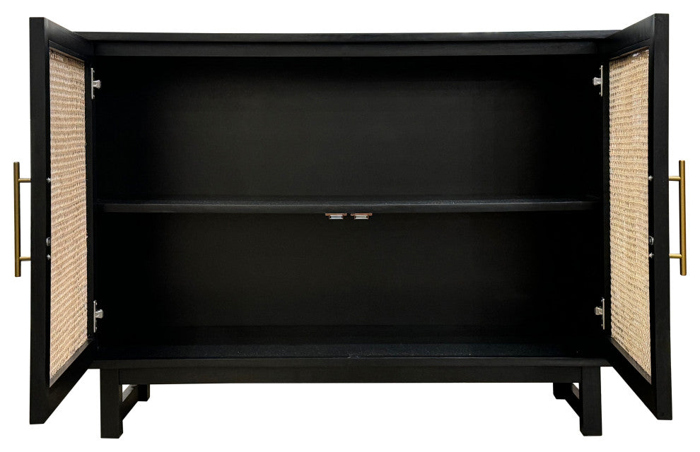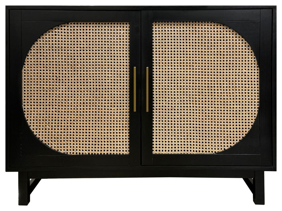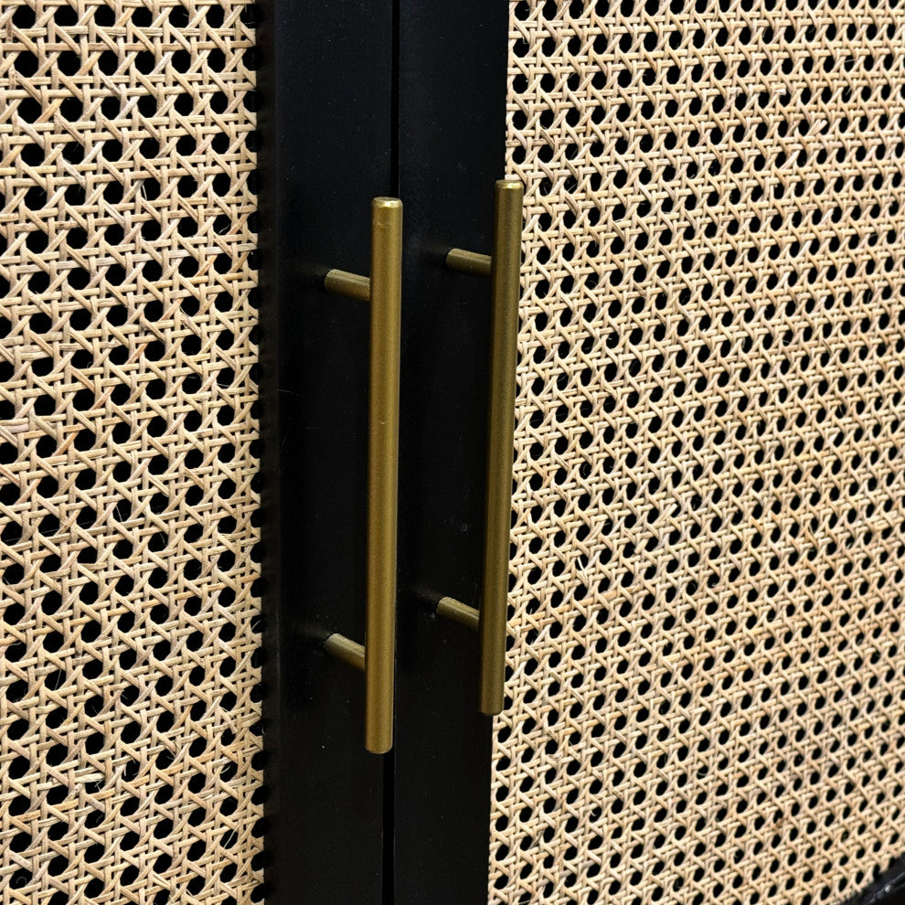 This sophisticated 2-door cabinet, crafted from Mindi wood and open-weave rattan, combines natural textures with modern elegance. The black painted finish contrasts beautifully with the rattan panels, accented by two sleek gold handles. Its body features a sturdy rectangular frame, raised on simple legs, and a curved pattern on the rattan fronts for added visual interest. Inside, one interior shelf provides practical storage. European hinges and magnetic closures ensure smooth and secure functionality