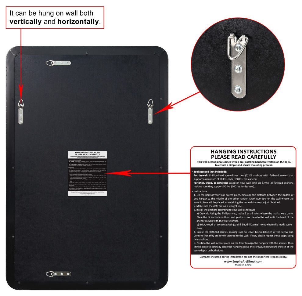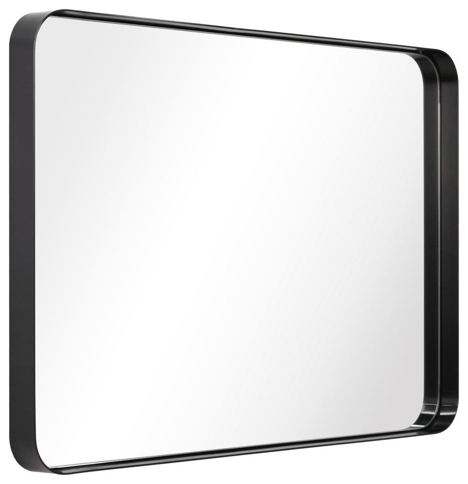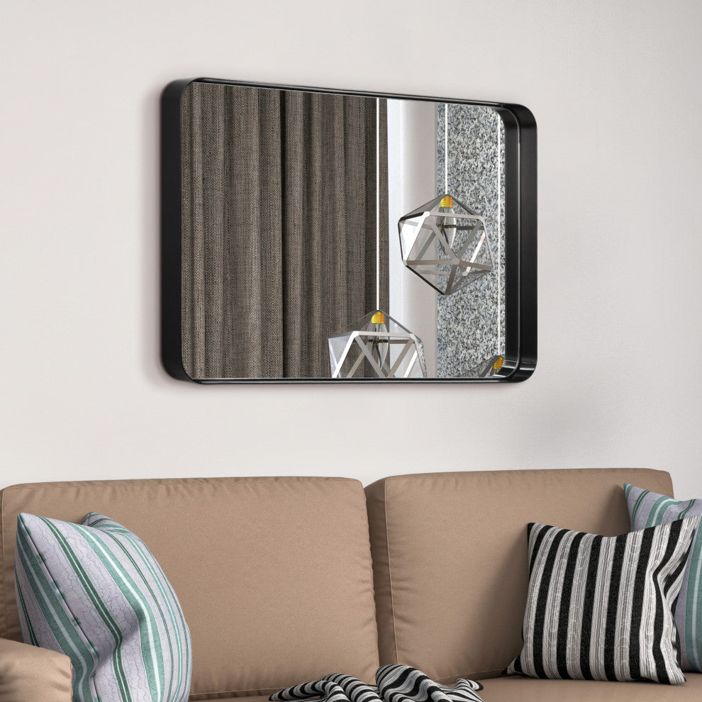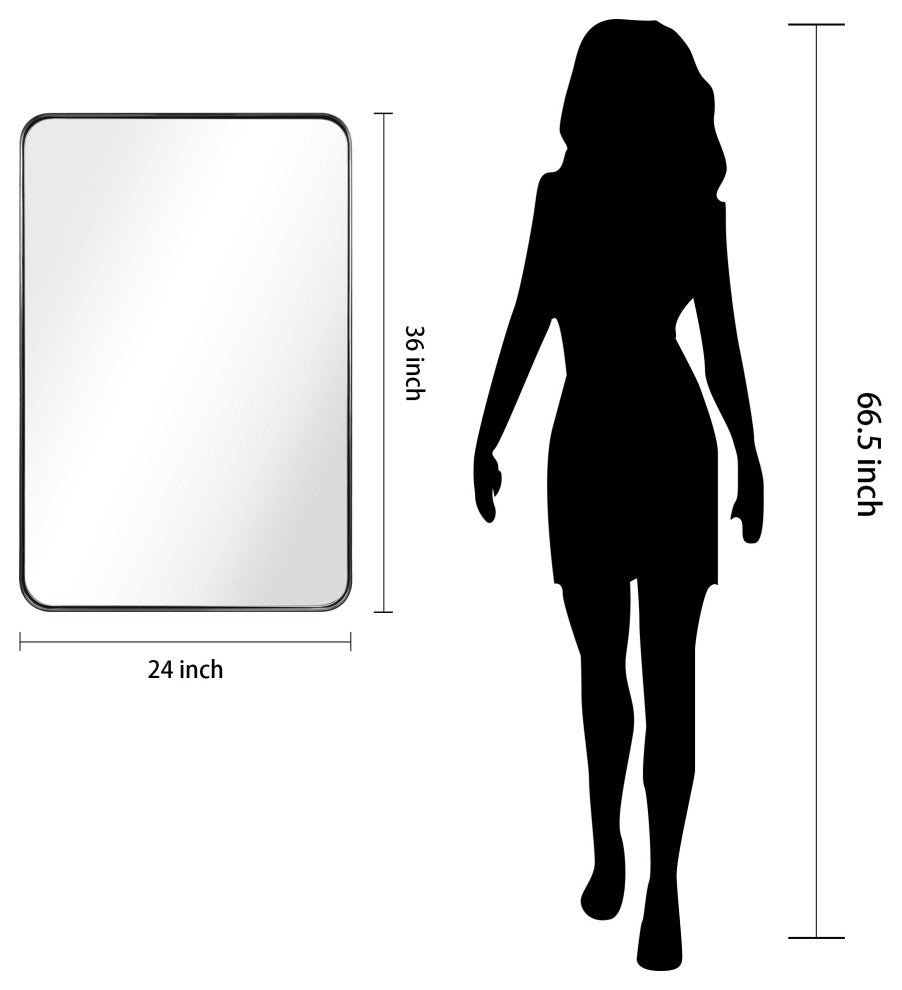 This inspiring 24" x 36" rectangular wall mirror is incredible for adding utility and function to wall space without compromising on minimalistic beauty. With a brushed black stainless-steel frame, this piece embodies the ultimate in quality and modern presentation. This mirror uses silver glass, making sure NO distortion or wrapping. All that is needed to hang this mirror are EZ anchors that can be purchased at your Lowes or Home Depot. 4 strong pre-installed D-Rings are attached to the back of the product for quick and easy installation either vertically or horizontally.