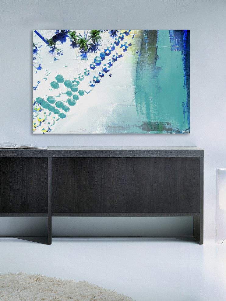 Striking and unique, the "Umbrella Blues" Painting Print On Wrapped Canvas by Parvez Taj will bring your walls to life. Printed on canvas, this 45 inch wide by 30 inch tall contemporary artwork will make a statement in any living room, dining room, or bedroom.- Fine art canvas print by Parvez Taj- Professionally hand stretched- Gallery wrapped in sustainable, non-warping Wood- Arrives ready to hang- Made in the USA- Includes a certificate of authenticity- Artist signature on the front