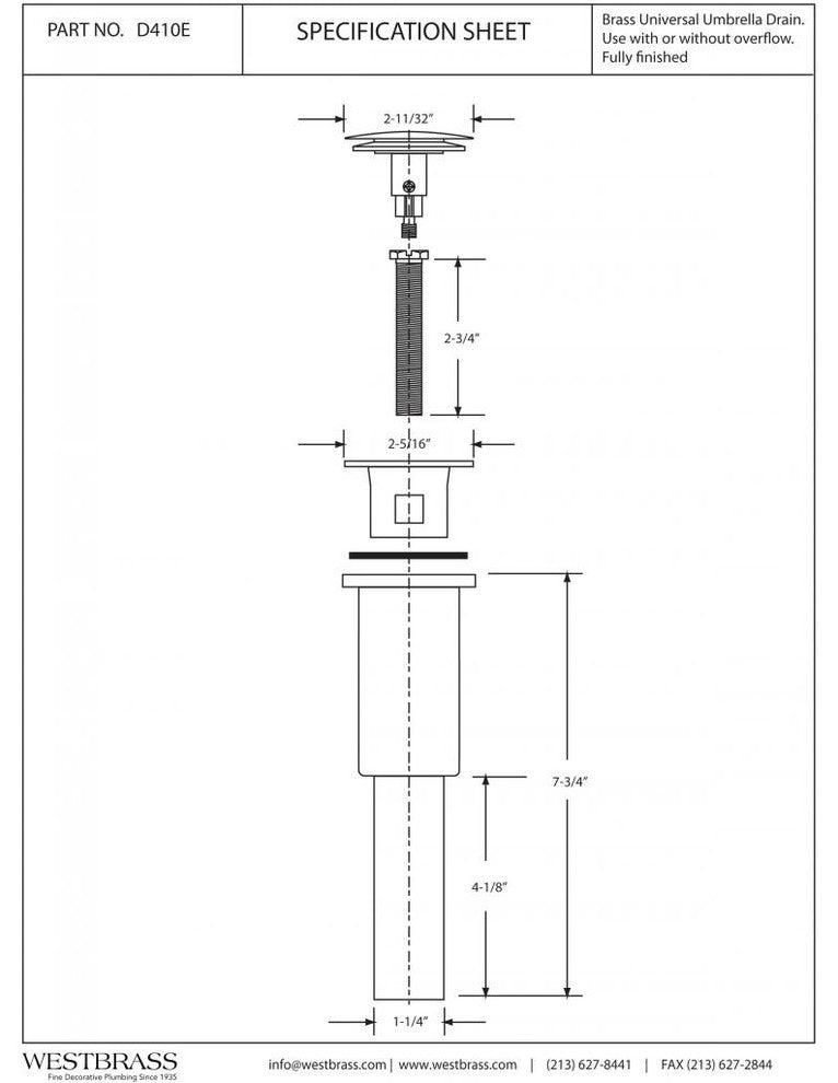 Umbrella lavatory drains open and close by pushing on the mushroom cap. This design seals well and eliminates the pull rod and linkage common in traditional lavatory drains. This drain has overflow drain holes in its drain cup; however, its unique design allows it to be used on sinks without overflow. The drain is fully finished below the sink, and the screw mounting system makes it ideal for extremely thin sinks. European umbrella push-down stopper. Fully finished for exposed installation. Fits extra-thin sheet metal sinks. Fits sinks up to 2-3/4 in. thick with an opening of 1-1/2 - 1-5/8 in. opening. Uses a 1-1/4 in. tailpiece. Heavy brass construction