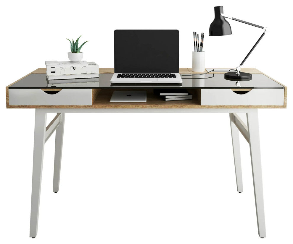 - This computer desk has a tempered glass work surface that provides ample space for everyday work essentials.