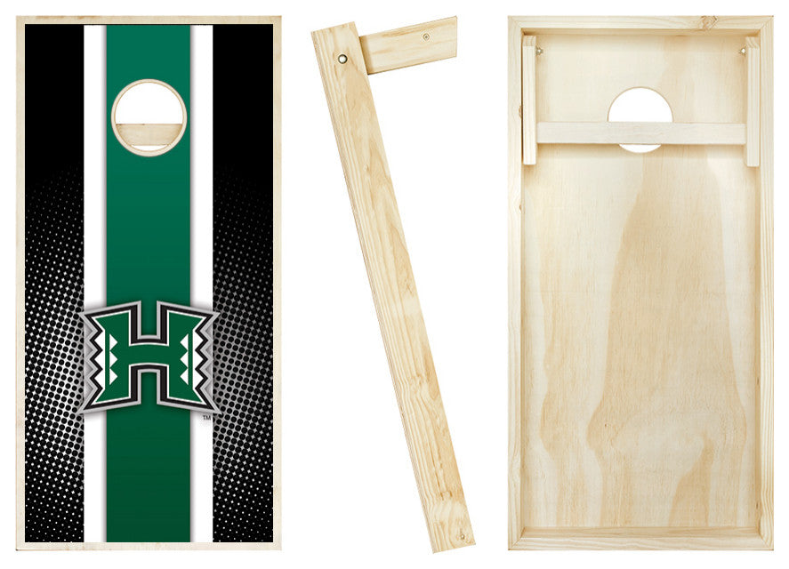 Officially Licensed University of Hawaii Cornhole Set. Show off your pride at your next cookout or tailgate with our signature striped design. Cornhole Set comes ready to play right out of the box, no assembly required! Set comes complete with 2 wooden game boards and 8 officially licensed University of Hawaii bags! Officially Licensed Collegiate ProductRegulation Size (2 Feet x 4 Feet)Tournament Grade ConstructionFolding Legs For Easy StorageAll Wood Construction Set Includes 8 Bags. All sets are made using a premium 2x4 frame and 1/2" sanded plywood playing surface. Each set has folding 2x4 legs secured with galvanized bolts.