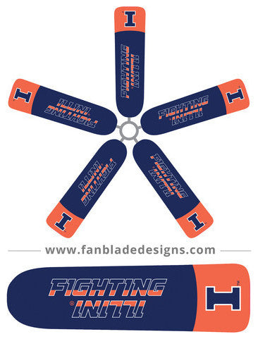 The Fighting Illini were named in honor of the veterans of WWI who hailed from the great state of Illinois. In the spirit of warriors everywhere, we''ve created University of Illinois Fan Blade Designs, made to keep fans clean and colorful. So fight the good fight and "Chehee, Cheha, Cheha-ha-ha, Go Illini Go!"Constructed from a quality, lightweight blend of polyester-spandex. Dye-sublimated so colors won''t fade in the wash. Fits ceiling fan blades that are 19.5-22 inches in length, 5 to 6 inches in width. Fan Blade Designs are machine washable ceiling fan blade covers created to keep ceiling fans clean and colorful. Sold as a set of five, these lightweight slip covers for ceiling fans come in more than 70 designs and two distinct decor lines, and are all made in the USA. The beauty of Fan Blade Designs is in their simplicity, practicality and ability to lend themselves to a number of different logos, themes and seasons. Made to fit over most standard ceiling fans, they eliminate the need for cleaning fans and provide a great decorative focal point in any room with a ceiling fan. When Fan Blade Designs get dirty, you simply slip them off and throw them in the wash. No more dusting the grit and grime off ceiling fans. Our home decor line has been designed to work in kids'' rooms, bedrooms, dining rooms, living rooms, lanais, man caves and game rooms. Our collegiate line, which is sublimated with the logos of 30 different universities across the country, is perfect for a TV room on game day, sports bars and restaurants, fraternity and sorority houses.Machine washable.Dye-sublimated so colors do not fade in the wash.Sold as a set of five.Fits ceiling fan blades that are 19.5-22 inches in length, 5-6 inches wide. Made in the USA