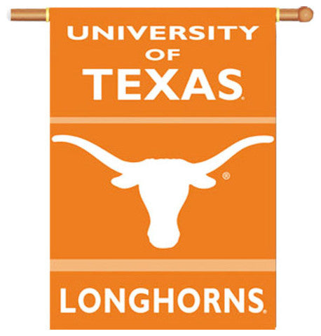 This University of Texas longhorn banner is designed to hang vertically from an outdoor pole or inside as wall decor. The 28" x 40" flag reads correctly from both sides. It has a liner sewn between the two sides so that no light shows through from the other side which eliminates the back side distortion. This banner has a generous 1.5" pole sleeve and is made of heavy polyester. Officially licensed by Collegiate Licensed Products and the University. Pole shown not included. Please visit our outdoor accessories page to find poles.