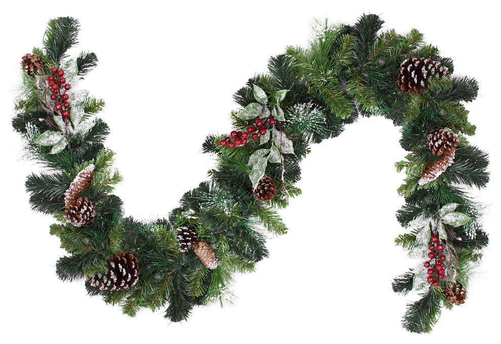 Realistic artificial pine garland is beautifully decorated with natural pine cones, red berries and a hint of white snow-like frostingAccented with long needle pine throughoutProduct Features:UnlitBendable wire center allows for you to shape the garland anyway you desireFor indoor use onlyBoth ends of the garland feature a wire hook for easy hangingDimensions: 6'' long x 9" wideMaterial(s): PVC/plastic/foam/metal/fabric/pine cones