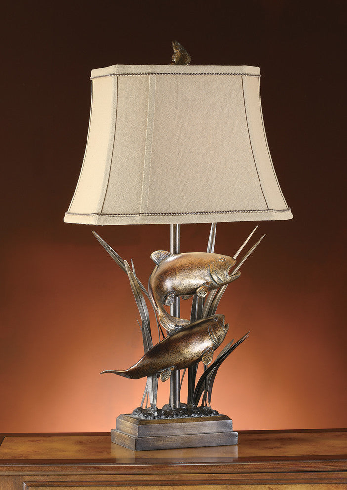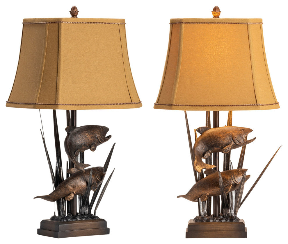 The Upstream Table Lamp features a handcrafted bronzed patina & wood finish. The lodged themed Upstream Table Lamp is a fisherman''s delight! The lamp measures 15L x 12W x 32H. It features a linen beige rectangle lamp shade and a brown power cord that measures 5.5ft long. The Upstream table lamp was manufactured in China.