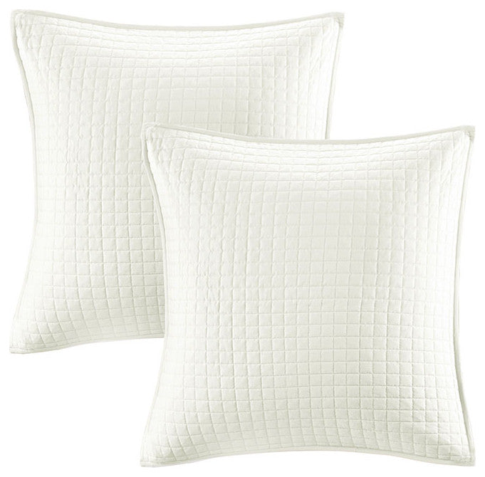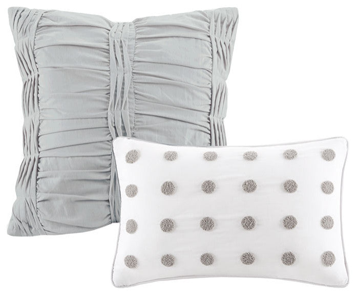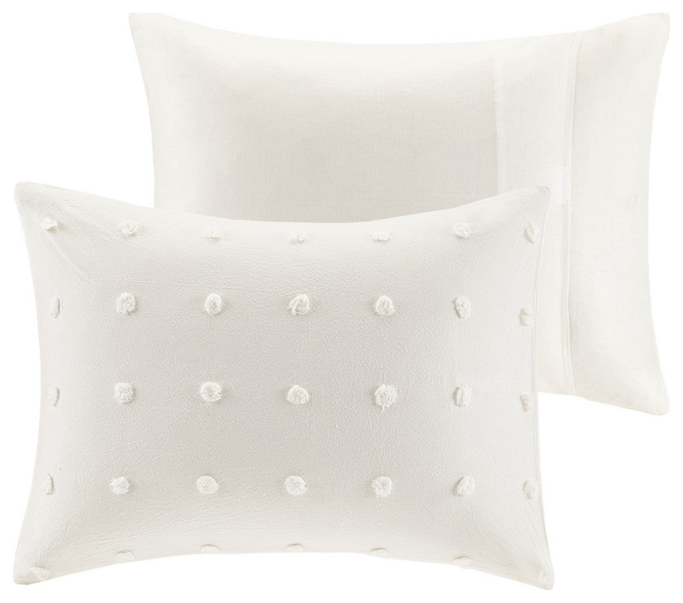 The Urban Habitat Brooklyn Cotton Jacquard Duvet Cover Set brings a soft and charming update to your bedroom. The ivory cotton duvet cover features small tufted chenille dots that create a fresh shabby chic look. Matching shams (1 in Twin/TwinXL) and quilted Euro shams (1 in Twin/TwinXL) complement the cotton jacquard duvet cover set. Two decorative pillows are also included, adding the finishing touches. This bedding set is also OEKO-TEX certified, meaning it does not contain any harmful substances or chemicals to ensure quality comfort and wellness. Button closures on the duvet cover secure a padded insert (NOT included) within the duvet cover and internal corner ties prevent it from shifting. Items in the set may come in a rolled or compressed packaging, which will need to be fluffed up or steam ironed before use to remove wrinkles.King/Cal King1 Duvet Cover:104"W x 92"L2 King Shams:20"W x 36"L (2)2 Euro Shams:26"W x 26"L + 0.5"Flange (2)1 Decorative Pillow:18"W x 18"L1 Decorative Pillow:12"W x 18"LMaterials:Duvet Cover/Sham: 100% cotton jacquard fabric on the face, 100% cotton reversePillow: 100% cotton cover with polyester fillingEuro sham: 100% cotton solid with quilting topMachine Wash. Spot Clean pillows