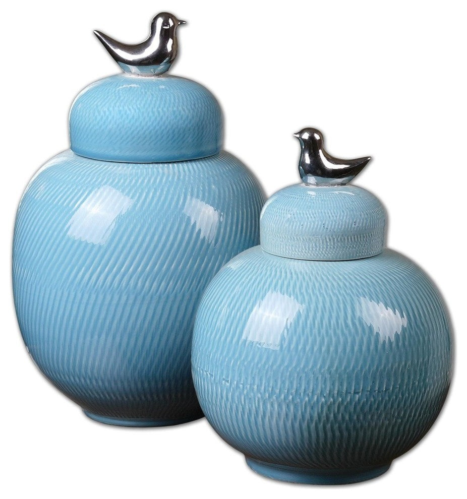 Bright blue ceramic with a swirl pattern accented with removable lids featuring silver birds on top. Sizes: Small-6 x 13 x 6, Large-6 x 17 x 6