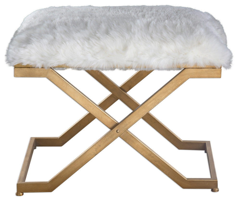Finish/Frame Description: Plush Faux Fur In Soft White Atop Legs Of Thick Industrial Hand Forged Iron Finished In Antiqued Gold Leaf.