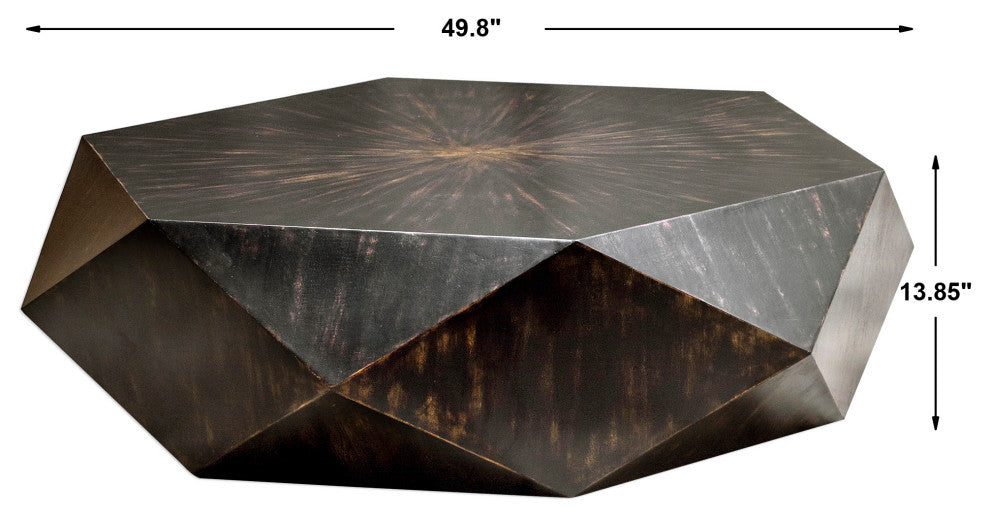 This Unique Geometric Table Features A Low Profile, Perfect For Viewing The Sunburst Top In Mango Veneer With A Worn Black Finish Rubbed To Reveal Honey Undertones.