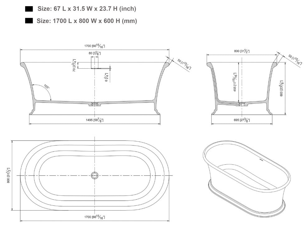 Vanity Art 67" Solid Surface Resin Stone Freestanding Bathtub