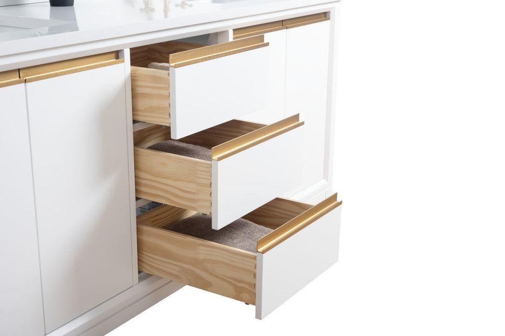 Vanity Art introducing the premium poplar wood bath vanity with sink. It is the perfect blend of functionality and style for your home. This essential piece offers generous storage space, featuring a Flip Down Tray, adjustable shelves, and drawers to keep your belongings organized and easily accessible. Crafted with convenience in mind, our sink cabinet boasts a sleek ariston engineered Marble countertop that not only adds a touch of elegance but is also a breeze to clean. The rectangular undermount sink complements the countertop, creating a seamless and eye-catching look for your bathroom. Built to last, our under-sink cabinet soft closing doors and drawers are equipped with premium-quality hinges, ensuring smooth and reliable operation. Versatility is key our vanity bathroom sink cabinets aren''t limited to the bathroom. With its stylish design and functional features, it''s the perfect fit for a kitchen cabinet with a sink.Specification:Item: Bathroom Vanity Cabinet (Fully Assembled) (Fully Assembled)Dimension: 72" W x 22" D x 34" HMaterial: Solid + Manufacturer WoodColor: WhiteSoft Closing Features IncludedHandle/Hardware: Golden BrushedFrame Material: Solid woodFaucet Hole: 3 (Faucet Not Included)Countertop: Ariston White Engineered MarbleSink Material: CeramicDoor: 04Number of Shelve: 02Number of Drawers: 03Number of Sink: 02Warranty: 1-YearElevate your home with Vanity Art Premium quality poplar wood Bathroom Vanity Cabinet where practicality meets with sophistication.