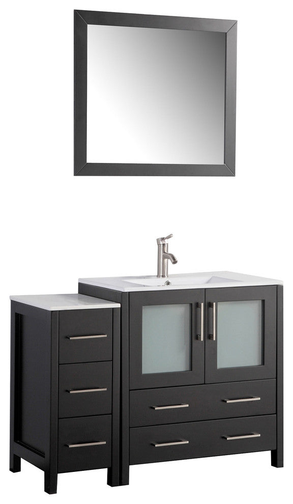 Let the clean-lined look of this vanity by Vanity Art guide your bathroom toward a cool, contemporary design. Single-sink vanity set with 30" vanity and 12" cabinetIncludes mirror, countertop, sink basin and cabinet hardwareDoes not include faucetCeramic countertopSoft-closing doorsDove-tailed drawersBrushed gold and brushed nickel handles/hardware1-year parts warranty against manufacture defectsColor: EspressoMaterials: Solid + Manufactured Wood, MirrorMirror dimensions: W 27.56" x H 27.56"Cabinet dimensions: 11.8" W x 18.1" D x 33.5" HVanity dimensions: 29.9" W x 18.1" D x 35.8" HTotal dimensions: 42" W x 18.1" D x 35.8" H